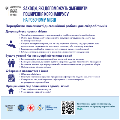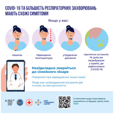 Якщо під час самоізоляції у Вас з’явились симптоми (кашель, ускладнене дихання, підвищена температура, діарея) – негайно зверніться за медичною допомогою та повідомте про свою історію подорожей та можливі контакти з особами, хворими на гострі вірусні захворювання.