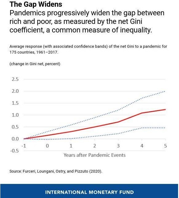 Так званий коефіцієнт Джині – широко використовувана міра нерівності – постійно збільшувався після цих подій. Оцінка заснована на чистих доходах, тобто ринкових доходах після сплати податків і трансфертів.«Наші результати показують, що нерівність збільшується, незважаючи на зусилля урядів щодо перерозподілу доходів від багатих до бідних для пом'якшення наслідків пандемій. Через п'ять років чистий Джині зріс майже на 1,5%», – зазначили в МВФ.