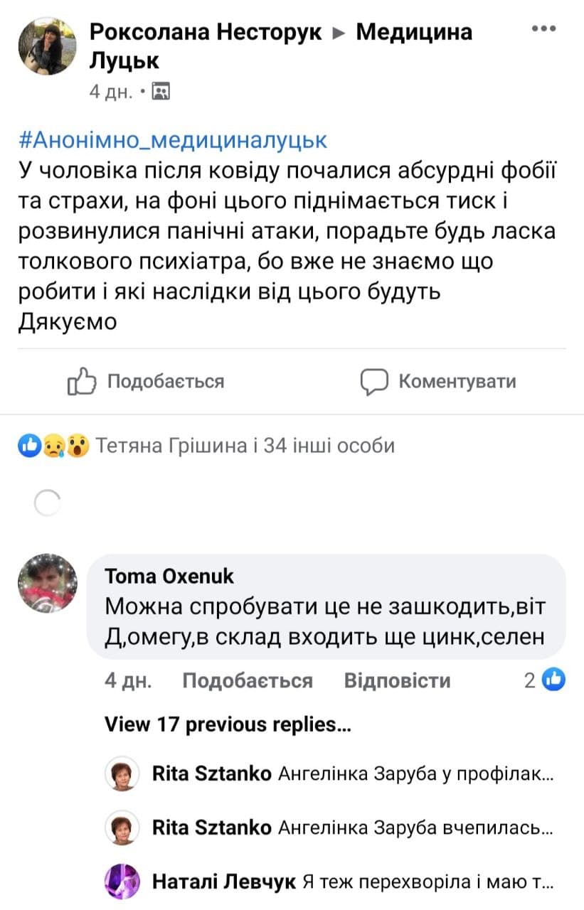 «У чоловіка після COVID-19 почалися абсурдні фобії та страхи, на фоні цього піднімається тиск і розвинулися панічні атаки. Порадьте, будь ласка, толкового психіатра, бо вже не знаємо, що робити і які наслідки від цього будуть», - пише користувачка в анонімному зверненні в спільноті Медицина Луцьк.На це користувачка Наталі Левчук відповіла, що «теж перехворіла, і має таку ж проблему – страхи, депресивний стан».