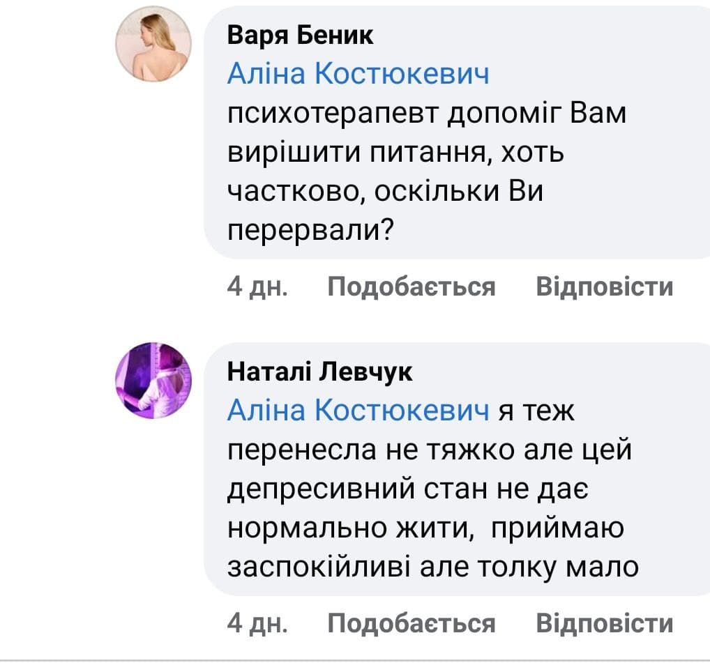 «Не можу з цим справитись… Теж перенесла (COVID-19, - ВН), не тяжко. Але цей депресивний стан не дає нормально жити. Приймаю заспокійливі, але толку мало», - пише жінка.Натомість, лучанка Аліна Костюкевич зазначила, що хворіла безсимптомно. Але, попри це, у неї загострились панічні атаки, які до захворювання, зі слів жінки, траплялися не частіше двох разів у місяць.