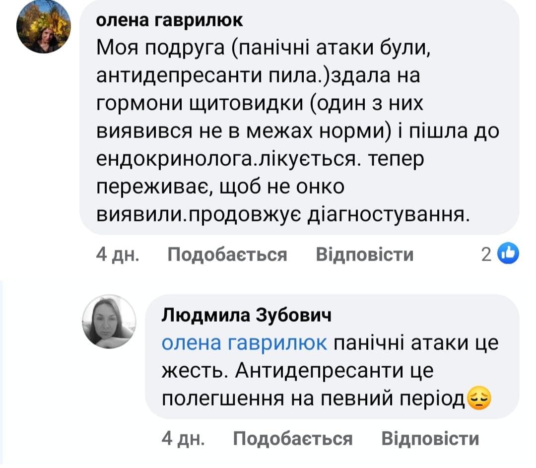 «Моя подруга (панічні атаки були, антидепресанти пила), здала на гормони щитовидки. Один з них виявився не в межах норми, тож вона (подруга, - ВН) пішла до ендокринолога. Лікується, тепер переживає, щоб онкологію не виявили. Продовжує діагностування», - розповіла користувачка, й додала, що, мовляв, «ковід приходить і виходить, а наслідки на багатьох органах і системах людини лишаються чогось».Натомість, лучанка Лариса Рижикова переконана, що такі розлади, як панічні атаки та депресія – не можуть бути наслідком COVID.