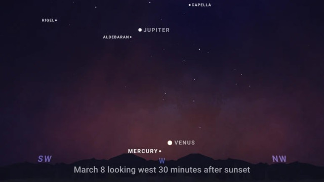 Найшвидшу планету Сонячної системи Меркурій можна буде побачити протягом перших 1,5 тижня березня. Планета з’являтиметься у вечірньому небі орієнтовано через 30 хвилин після заходу Сонця.