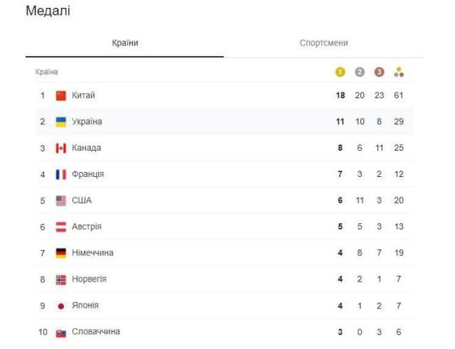 За підсумками Паралімпіади-2022 Україна виборола 11 золотих, 10 срібних та 8 бронзових нагород. У загальному медальному заліку наші спортсмени поступилися лише Китаю та посіли 2 місце.