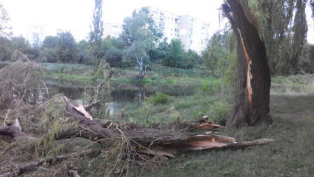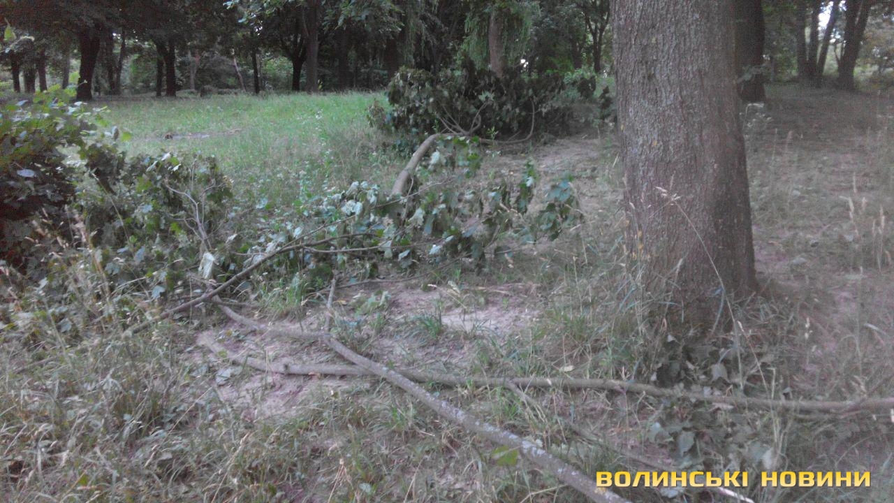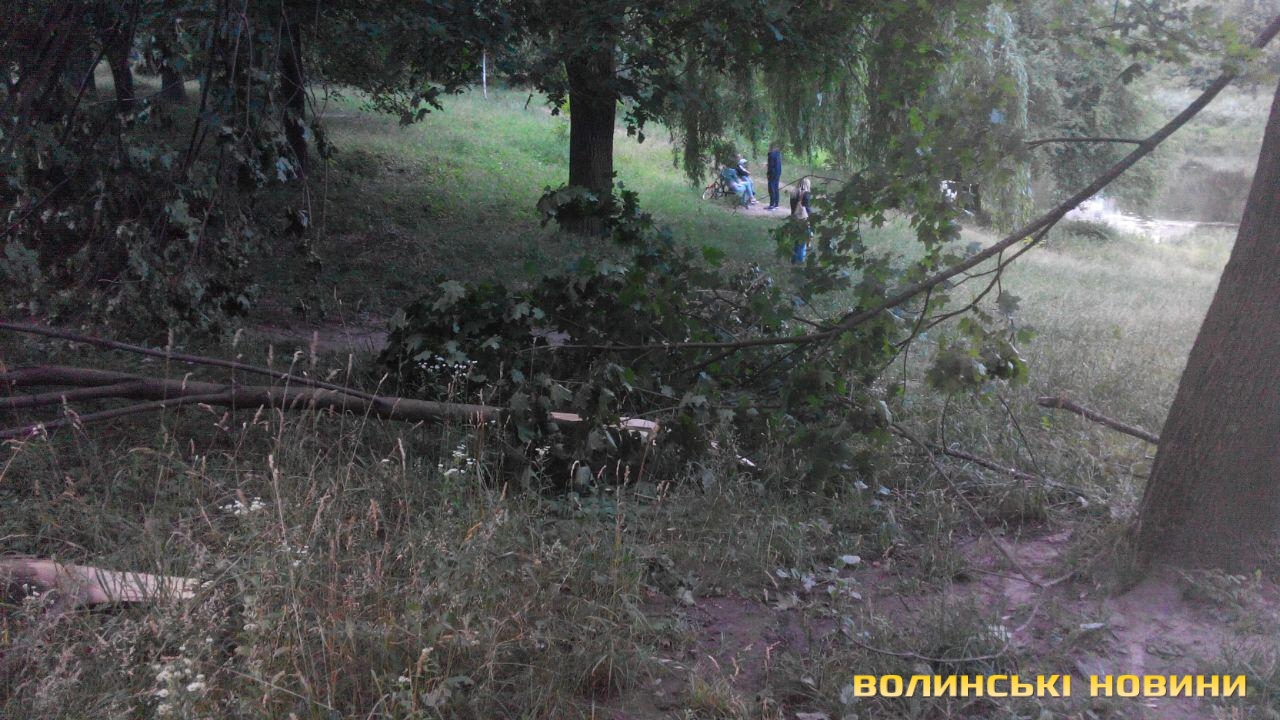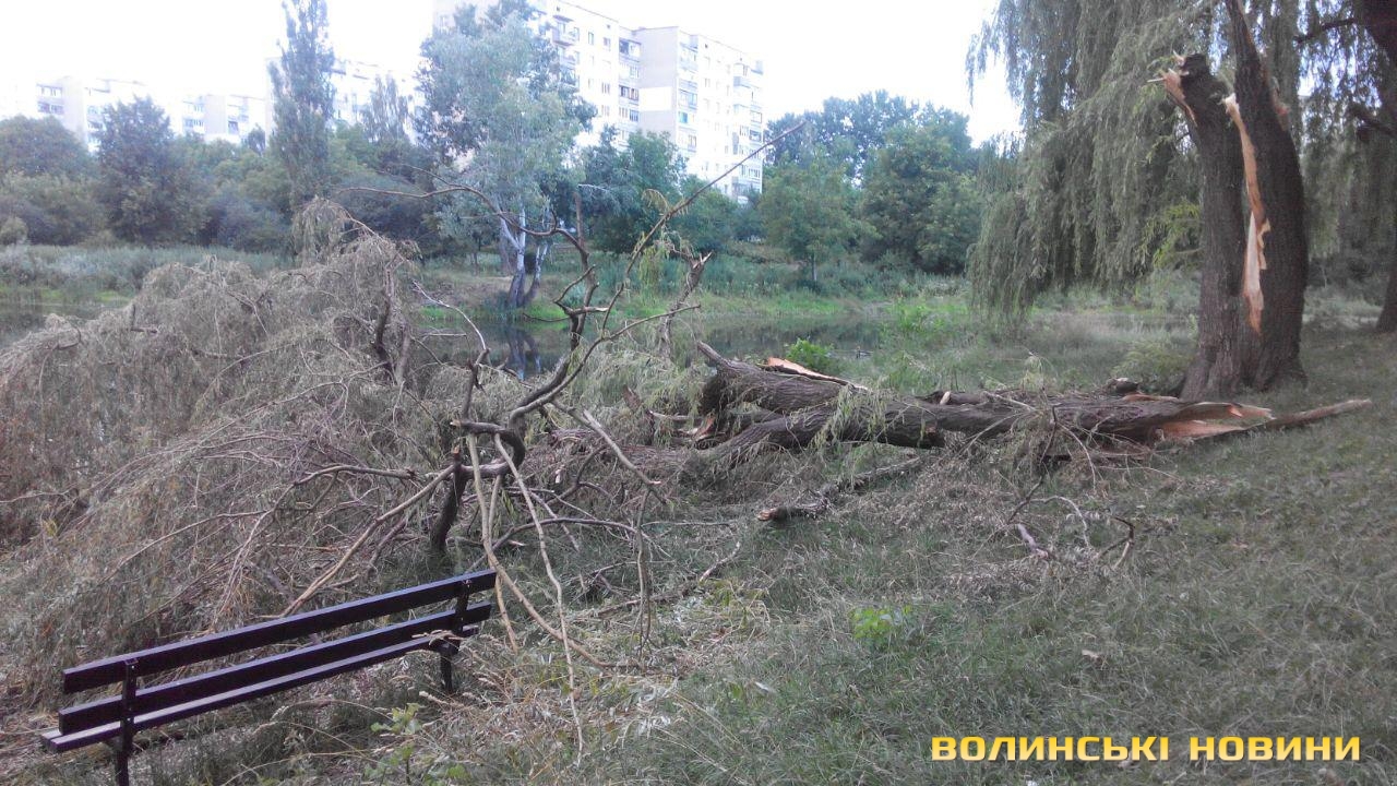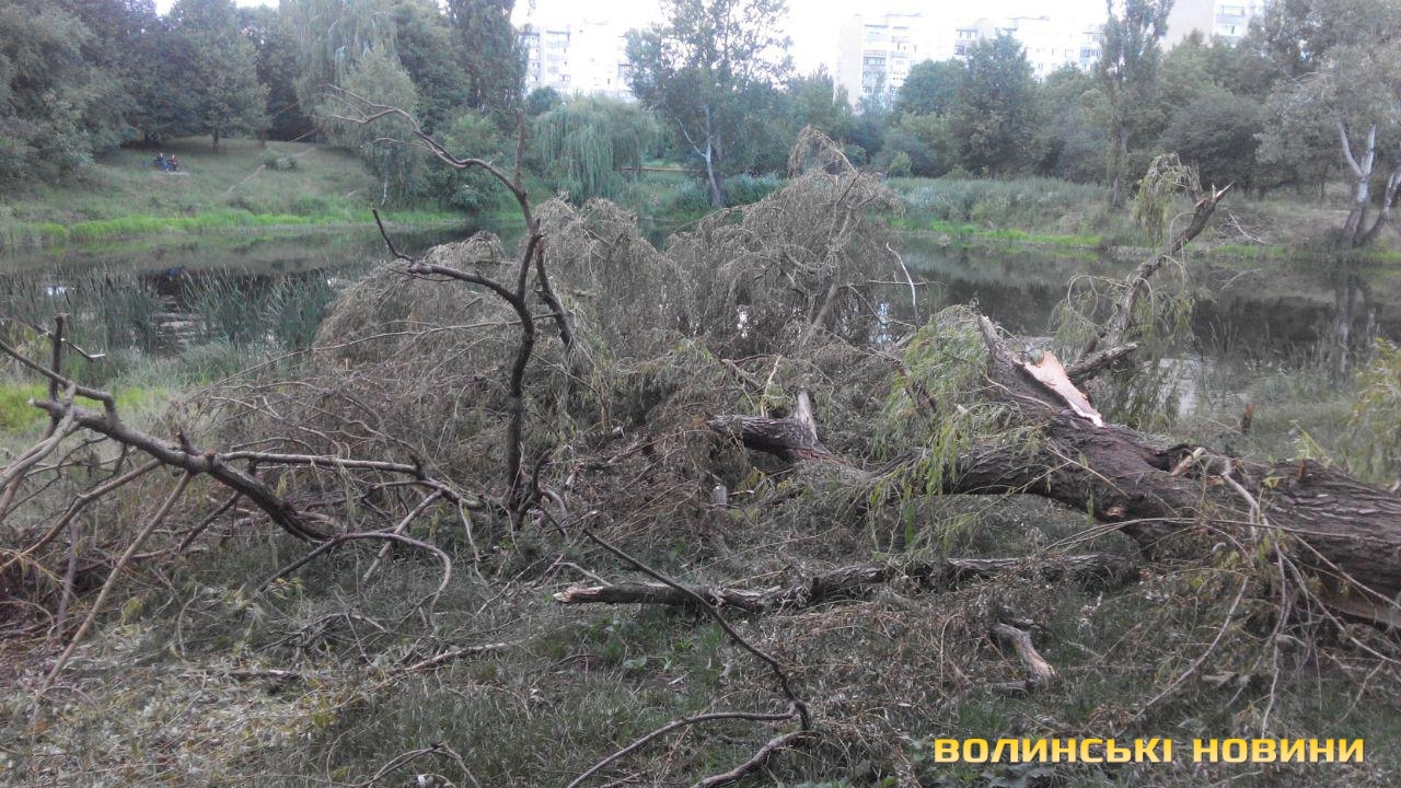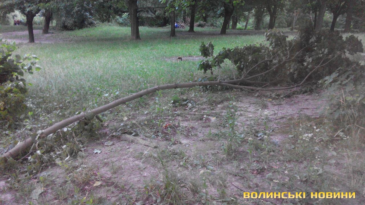 Попри те, що після зливи, яка лютувала в Луцьку, минув уже тиждень, деякі наслідки негоди досі не вдалося усунути. Так, в окремих мікрорайонах міста, зокрема й у парку 900-річчя, ще не прибрали повалені дерева та зламане гілля.