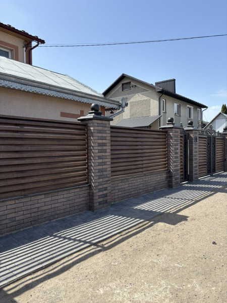 - • рустикальна або фактурна цегла — додає огорожі виразності та об’єму;