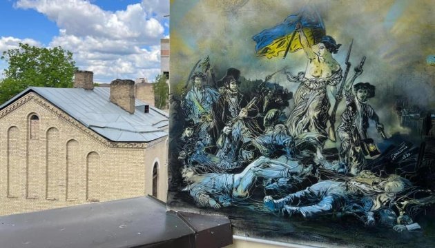 У Києві митець намалював графіті «Свобода, яка веде народ» у кольорах України на терасі Посольства Франції, роботу, присвячену Тарасу Шевченку, а також кілька графіті на фоні зруйнованих будівель.
