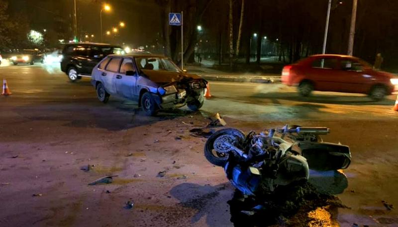 Пасажирка мотоцикла перелетіла через передню частину авто та впала на землю, отримавши відкриті переломи правої великогомілкової та малогомілкової кісток.