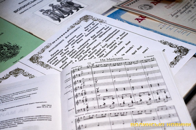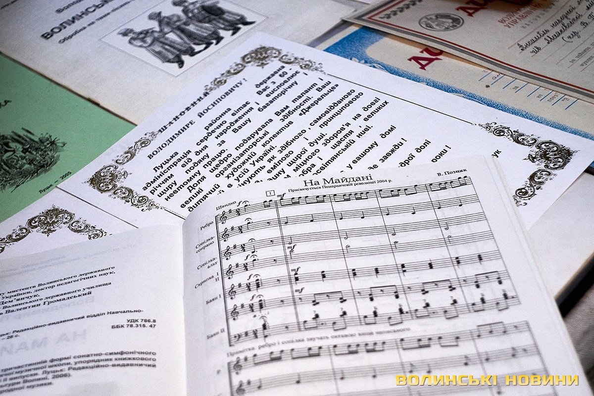 На виставці є різноманітні збірники обробок на теми пісень композиторів нашого краю, наприклад — «Волинські візерунки», і на теми народних мелодій — «Волинська фантазія», і музичні присвяти Помаранчевій революції — «На Майдані». Більшість цих публікацій побачили світ завдяки дружбі Володимира Позняка з Сергієм Цюрицем, який переконав таки Маестро у тому, що цим безцінним скарбом необхідно поділитися з усіма любителями української музики.«Фішкою» виставки є, безперечно, можливість почути звучання кожного експоната. За це велика вдячність синові Володимира Позняка. Володимир Володимирович, сам професійний музикант, не лише зберіг та збагатив батькову колекцію. Спеціально для виставки він зіграв на кожному інструменті. Записані звуки завантажили на Ютуб-канал музею. То ж біля кожного раритету розміщено QR-код, зісканувавши який можна почути, у прямому сенсі слова, звучання минувщини.Фото Олександра Дурманенка.