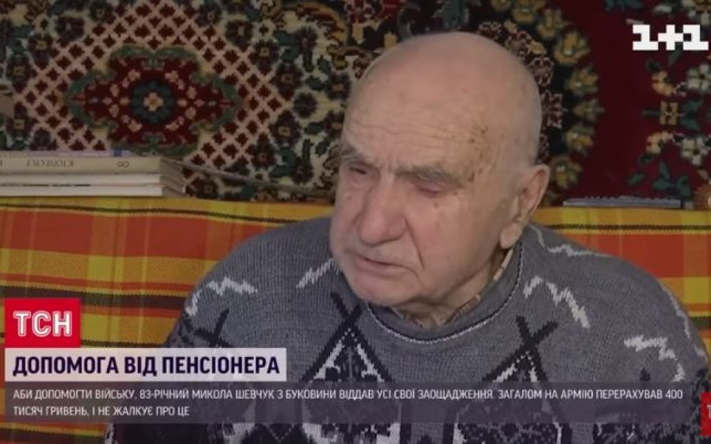 400 тисяч гривень віддав для військових 83-річний пенсіонер з Буковини Микола Шевчук. Дідусь заощаджував кошти усе життя, економив, та коли почалася велика війна, без вагань вирішив допомогти тим, чим може. За такий вчинок Президент нагородив чоловіка відзнакою «За заслуги».
