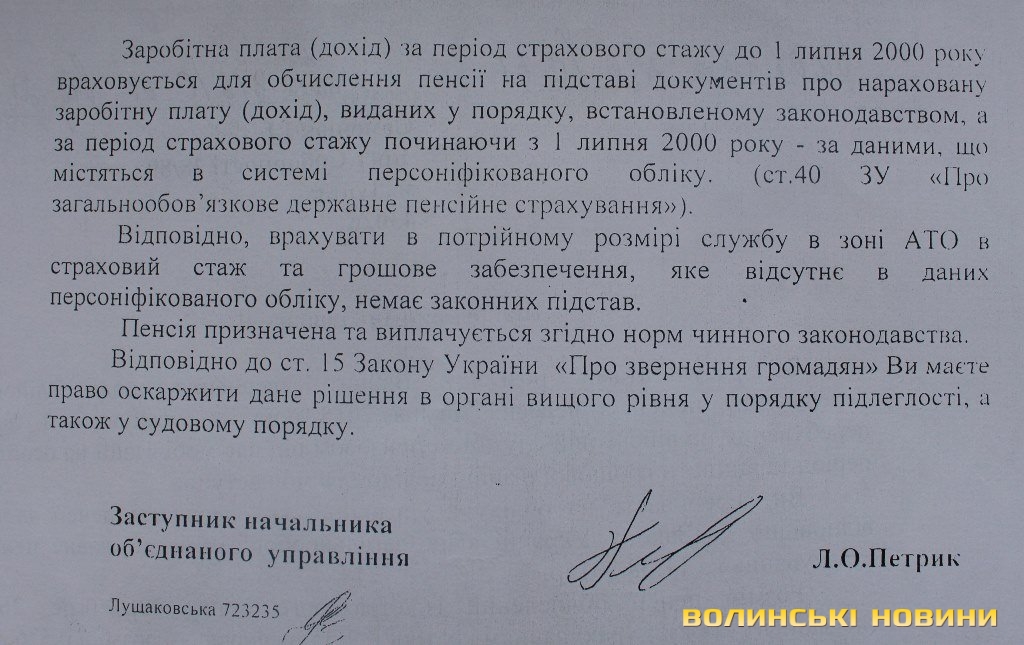 «При обчисленні страхового стажу і пенсійних виплат, увесь мобілізаційний період - із 31 січня 2015 року по вересень 2015 не зараховували. Тому я звернувся у Пенсійний фонд 21 червня 2017 року, аби виправити ситуацію та провести правильний перерахунок. Втім, отримав відмову, в якій вони мені написали, що цього не зроблять, буцімто, немає даних про оплату страхових внесків у системі пенсійного обліку. Це - незаконно. Але ж з нас знімали відрахування... В такому випадку, згідно з їхньою логікою, нам мають бути повернуті гроші, зняті раніше. Але ж і гроші не схотіли повертати», - пояснює учасник бойових дій.