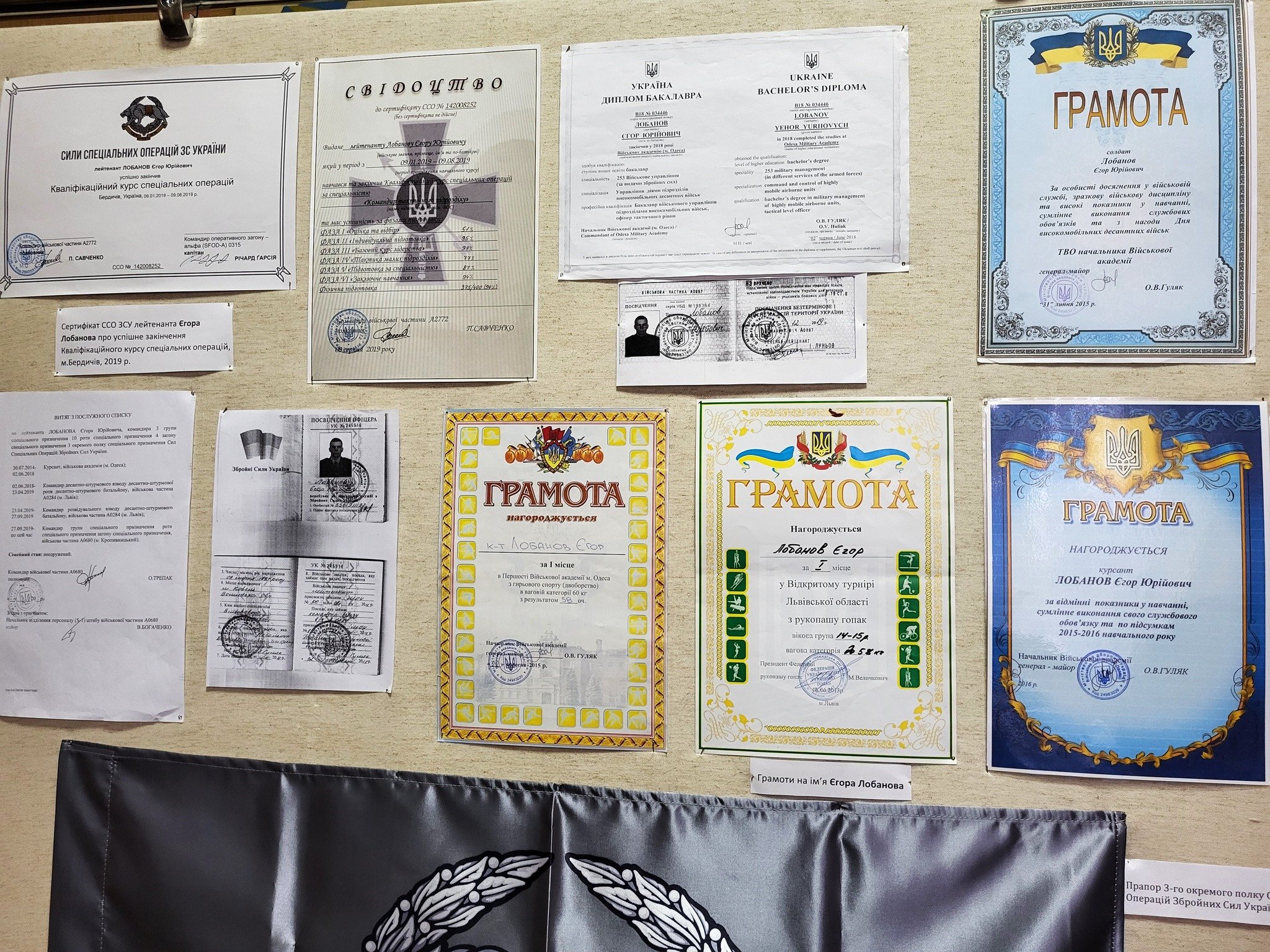Лобанова Єгора Юрійовича нагороджено (посмертно) орденом Богдана Хмельницького III ступеня та присвоєно звання «Почесний громадянин міста Ковеля». Одну з міських вулиць перейменовано – на вулицю Лобанових.В експозиції представлені документи Героя, особисті речі, зокрема, його головні убори, як елементи військового однострою. Також експонуються персональні ідентифікаційні жетони Єгора Лобанова, його відзнаки. Можна побачити бойові та державні прапори, які передала у музей мама загиблого Героя Оксана Лобанова.