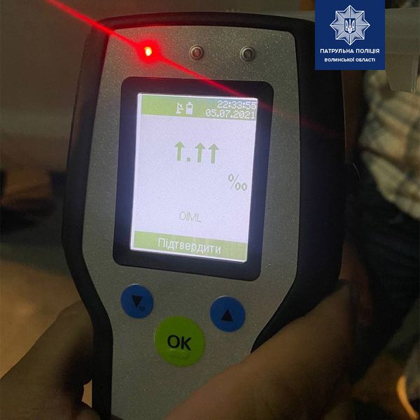 У присутності свідків, водій пройшов огляд на визначення стану алкогольного сп’яніння на місці зупинки. Результат – драгер «показав у небо», що становить 5 проміле (перевищення допустимої норми у 25 разів).
