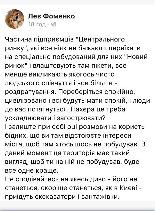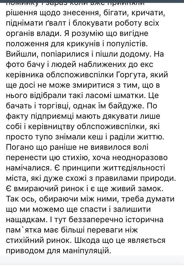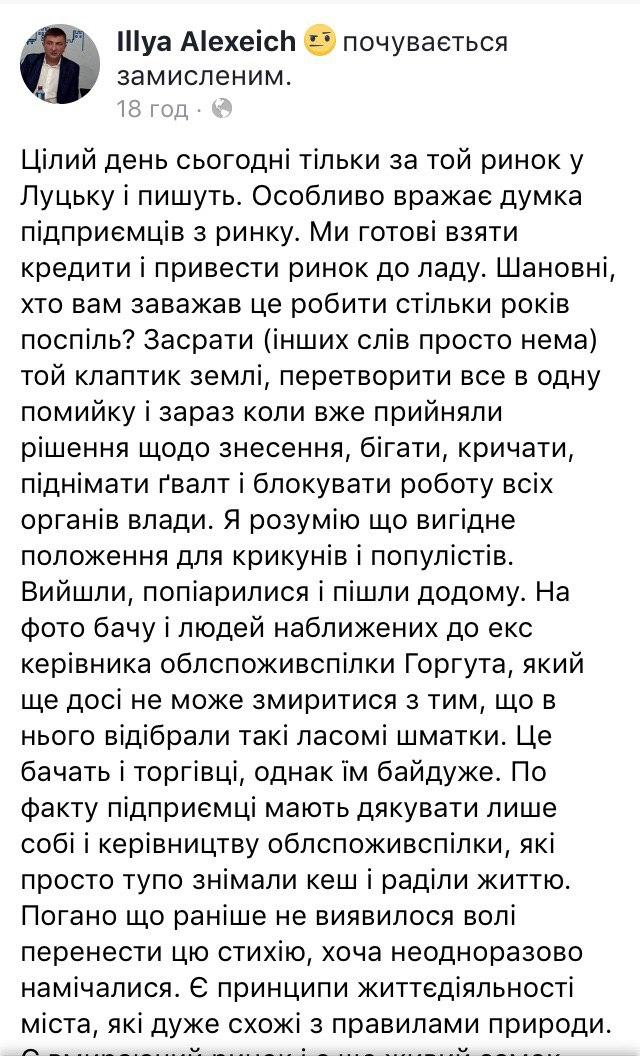 «Цілий день сьогодні тільки за той ринок у Луцьку і пишуть. Особливо вражає думка підприємців з ринку. Ми готові взяти кредити і привести ринок до ладу. Шановні, хто вам заважав це робити стільки років» поспіль? Засрати (інших слів просто нема) той клаптик землі, перетворити все в одну помийку і зараз, коли вже прийняли рішення щодо знесення, бігати, кричати, піднімати ґвалт і блокувати роботу всіх органів влади», – каже лучанин.