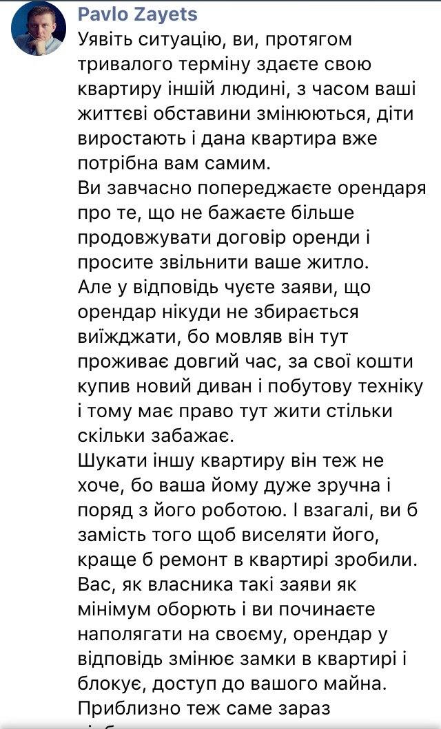 «Уявіть ситуацію, ви, протягом тривалого терміну здаєте свою квартиру іншій людині, з часом ваші життєві обставини змінюються, діти виростають і дана квартира вже потрібна вам самим. Ви завчасно попереджаєте орендаря про те, що не бажаєте більше продовжувати договір оренди і просите звільнити ваше житло. Але у відповідь чуєте заяви, що орендар нікуди не збирається виїжджати, бо мовляв він тут проживає довгий час, за свої кошти купив новий диван і побутову техніку і тому має право тут жити стільки скільки забажає. Шукати іншу квартиру він теж не хоче, бо ваша йому дуже зручна і поряд з його роботою. І взагалі, ви б замість того щоб виселяти його, краще б ремонт в квартирі зробили», – пише він.