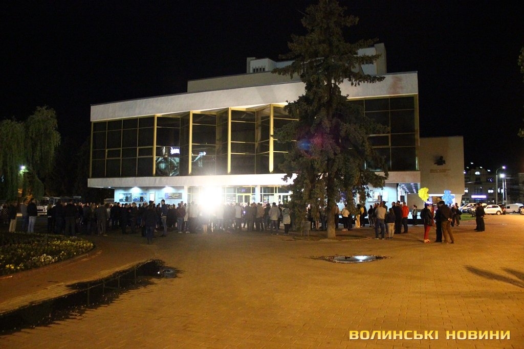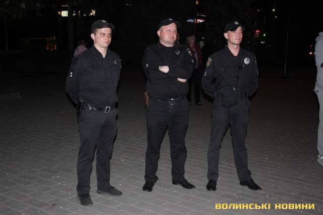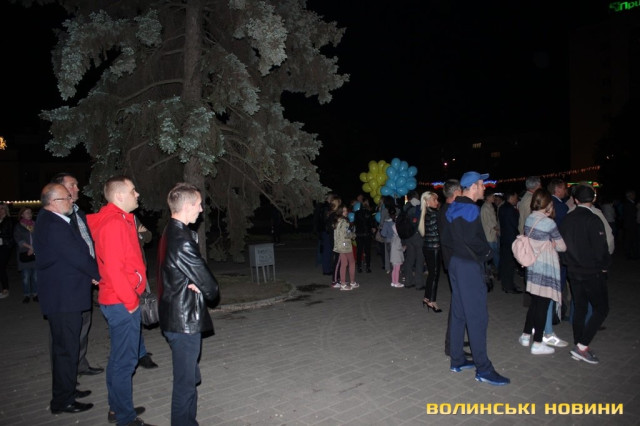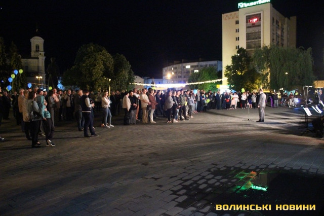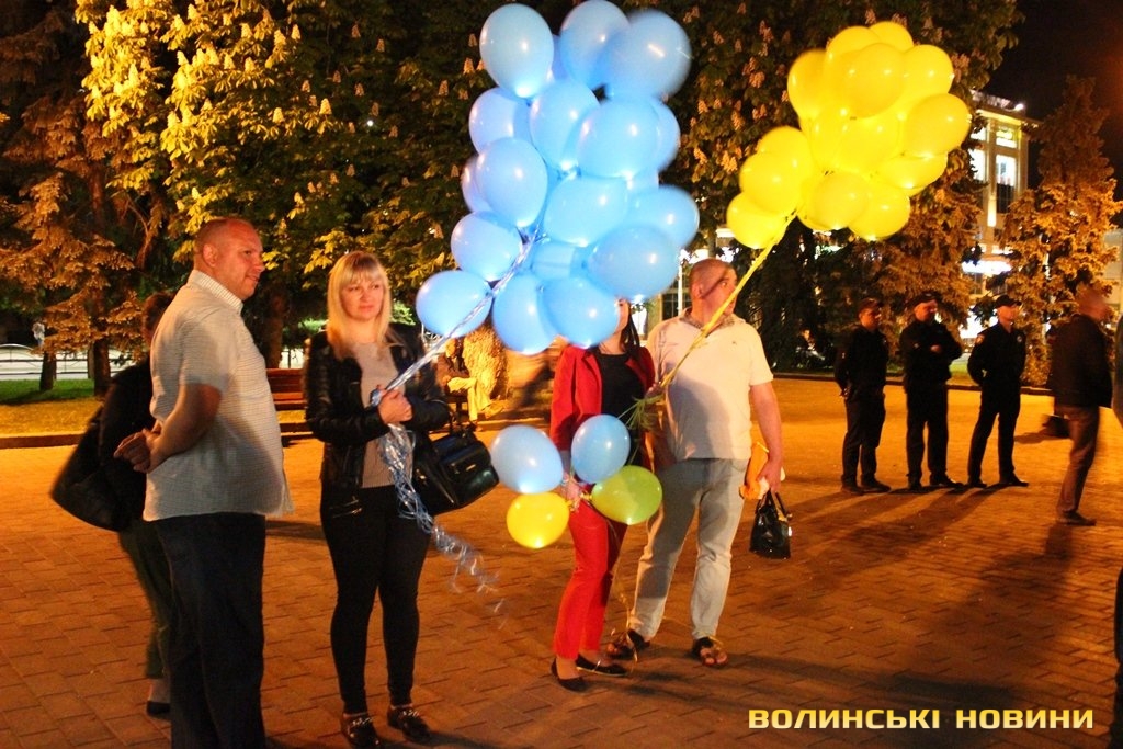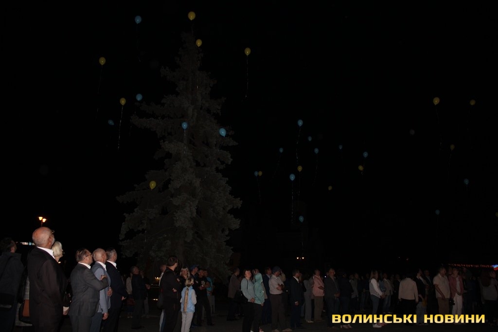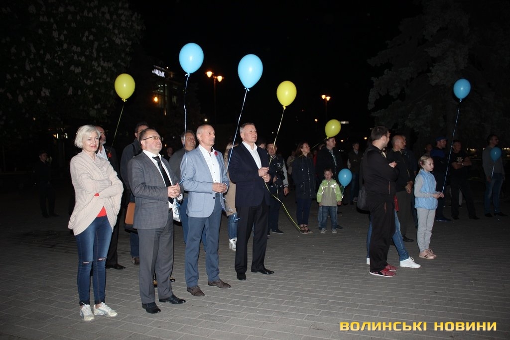 Із 22:30 на Театральний майдані звучали патріотичні пісні, а рівно о 23:00 присутні запустили у небо блакитні та жовті кульки.