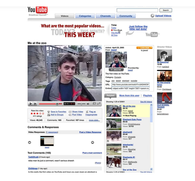 Також до колекції музею увійшло перше завантажене на сайт 19-секундне відео Me at the zoo. У ролику 25-річний співзасновник YouTube Джавед Карім розповідає про слонів.Відео, зняте на цифрову камеру з низькою роздільною здатністю, стало поворотним моментом у розвитку користувацького контенту в інтернеті, що відкрило нові способи самовираження та змінило спосіб створення і споживання медіа.