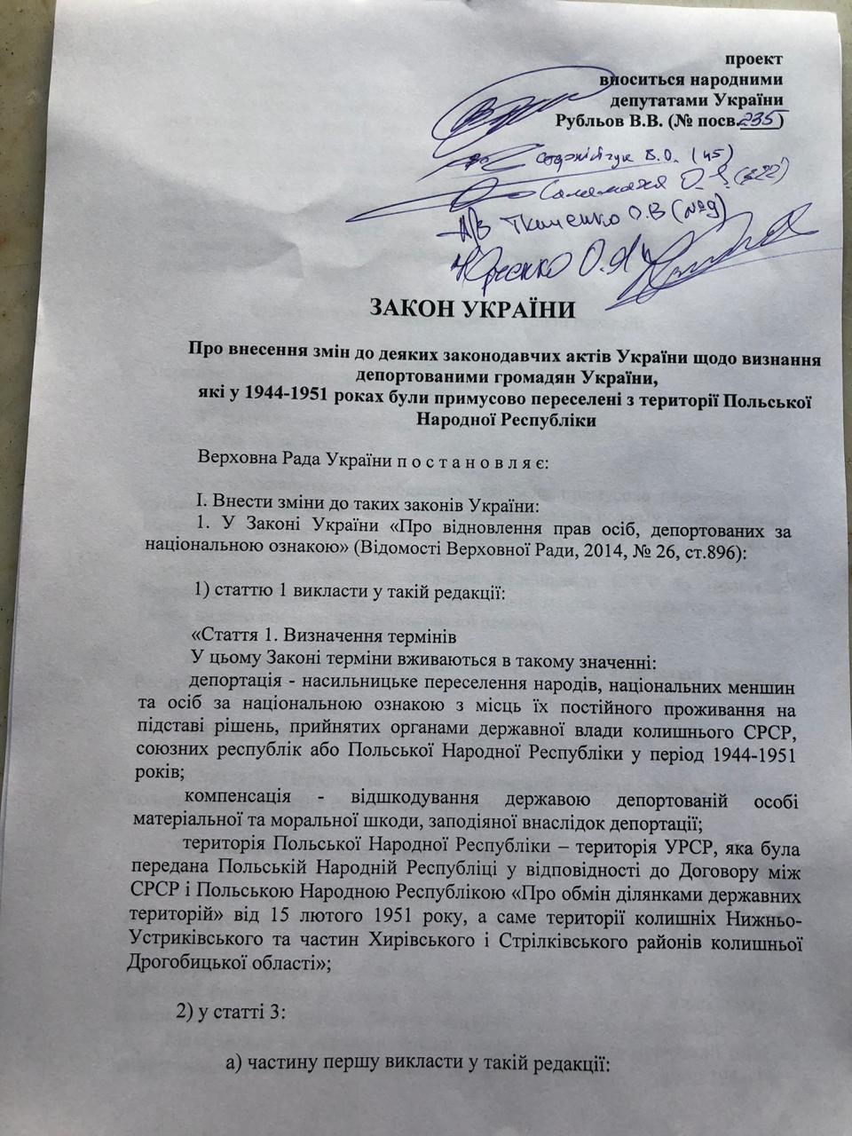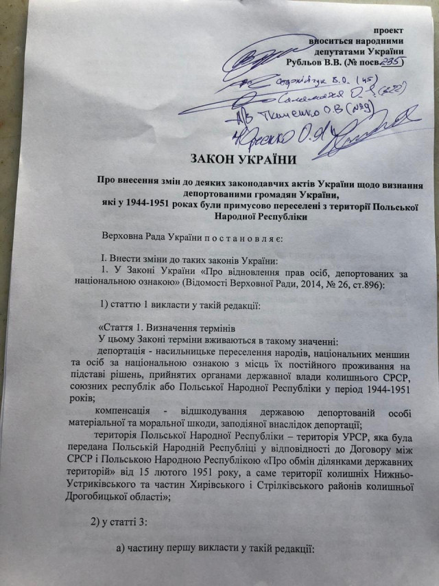 Проєкт Закону «Про внесення змін до деяких законодавчих актів України щодо визнання депортованими громадян України, які у 1944-1951 роках були примусово переселені з території Польської Народної Республіки» став першим, який підготував народний депутат України Вячеслав Рубльов.