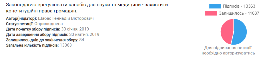 Петиція про законодавче врегулювання канабісу для науки і медицини на сайті Верховної Ради на ранок 4 лютого набрала 13 3630 підписів з необхідних 25 000, і це сталося менше ніж за тиждень - за 6 днів після створення петиції, пише Страна.