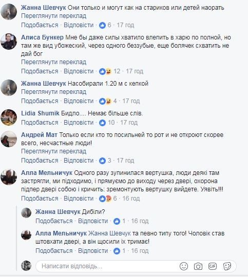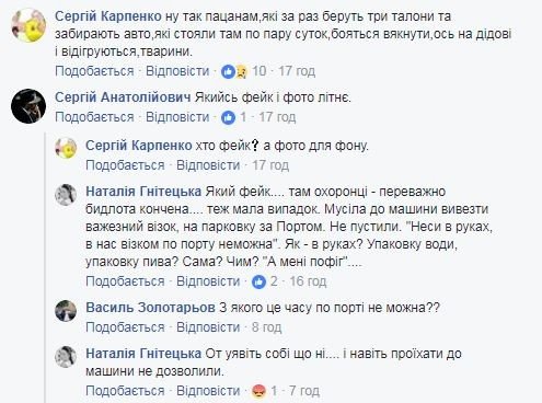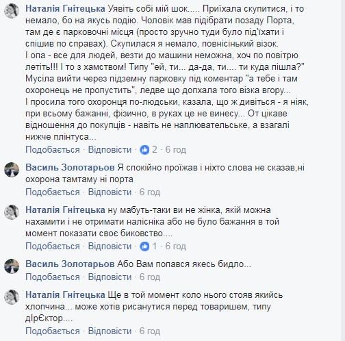 «Хотілось просто натовкти пику за таке відношення до клієнтів. Понад півгодини не давали проїхати і метра, кричали та принижували, вимагаючи 10 гривень. Вступилась, кажу – я заплачу за нього, уявіть на хвилинку, що це мій батько, у відповідь - п’яне булькотіння, я тут за всяких **** платити не збираюся… Ледве відпустили, дідусь з нервів і талон знайшов. Охорона «Порта», ваша зарплатня відповідає вашому нікчемному інтелектуальному рівню!», - обурюється жінка