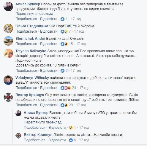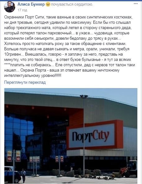 «Охоронці «Port City», такі солідні в своїх синтетичних костюмах, жодного дня тверезими, сьогодні здивували по максимуму. Якби хтось чув набір триповерхового мата, який летів у бік старенького дідуся, який загубив паркувальний талон. Чудовиська, які думають, що вони «сек’юріті», довели бідолаху до тремтячих рук», - пише Аліса.