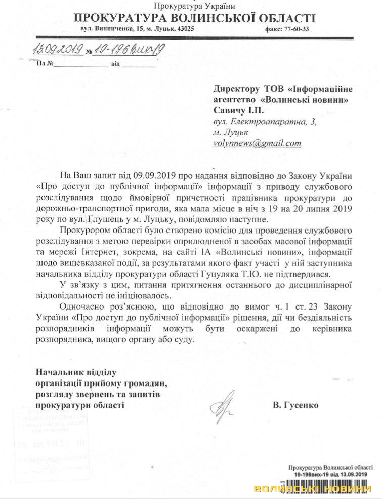 Раніше Інформаційне агентство Волинські Новини зверталось із запитом у прокуратуру, аби з'ясувати чи понесе покарання Тарас Гуцуляк за вчинене ДТП, на що у прокуратурі повідомили, що за результатами перевірки участь у ДТП заступника начальника відділу прокуратури області Гуцуляка Т. Ю. не підтвердилась, тому його не приятягатимуть до дисциплінарної відповідальності.