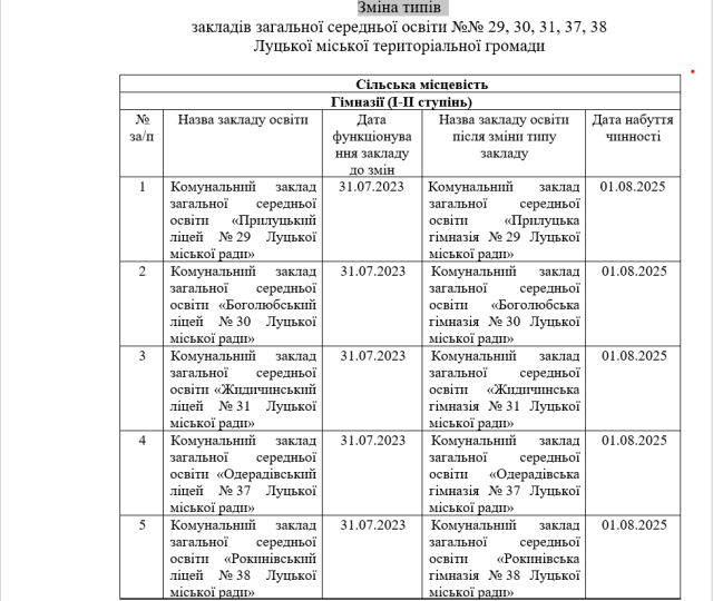 П’ять ліцеїв Луцької громади із 1 серпня отримають статус гімназій. Навчання буде здійснюватися без 10 і 11 класів.