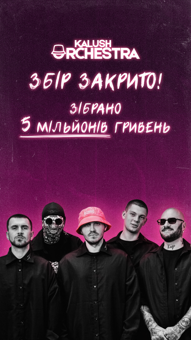 Напередодні Дня Незалежності України гурт KALUSH Orchestra анонсував великий збір коштів на реабілітацію захисників Маріуполя та «Азовсталі». Опівночі 24 серпня гурт у своїх соцмережах закликав українців донатити по 24 гривні протягом лише 24 годин. І всього за одну добу їм вдалося зібрати п’ять мільйонів гривень!