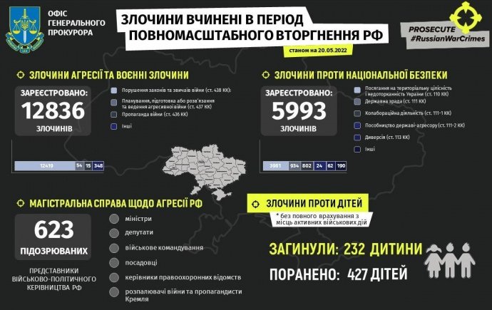 Станом на ранок 20 травня щонайменше 659 дітей постраждали в Україні внаслідок дій російських військових. Ці цифри не остаточні, оскільки триває робота з їх встановлення в місцях ведення активних бойових дій, на тимчасово окупованих та звільнених територіях.