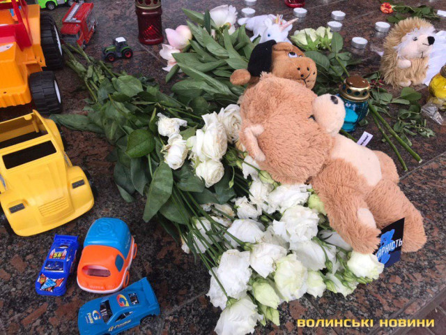 Містяни принесли з собою плакати, наклейки, м’які іграшки, лампадки, свічки та квіти. Як діляться, навіть не можуть уявити, що довелося пережити батькам загиблої дитини.