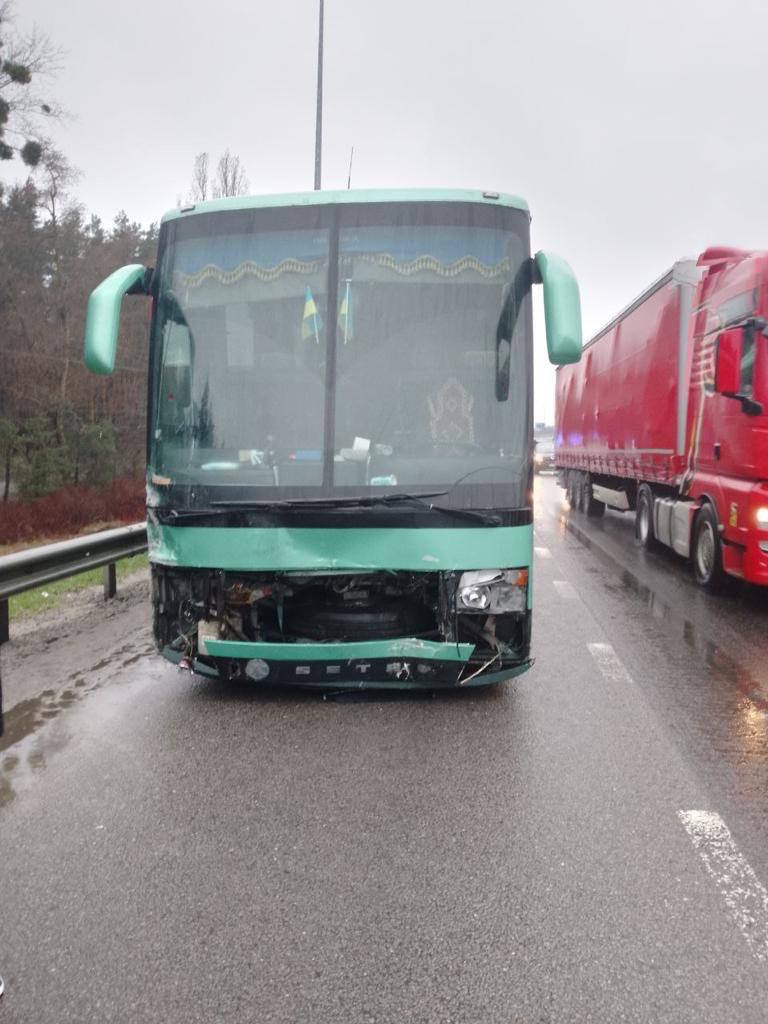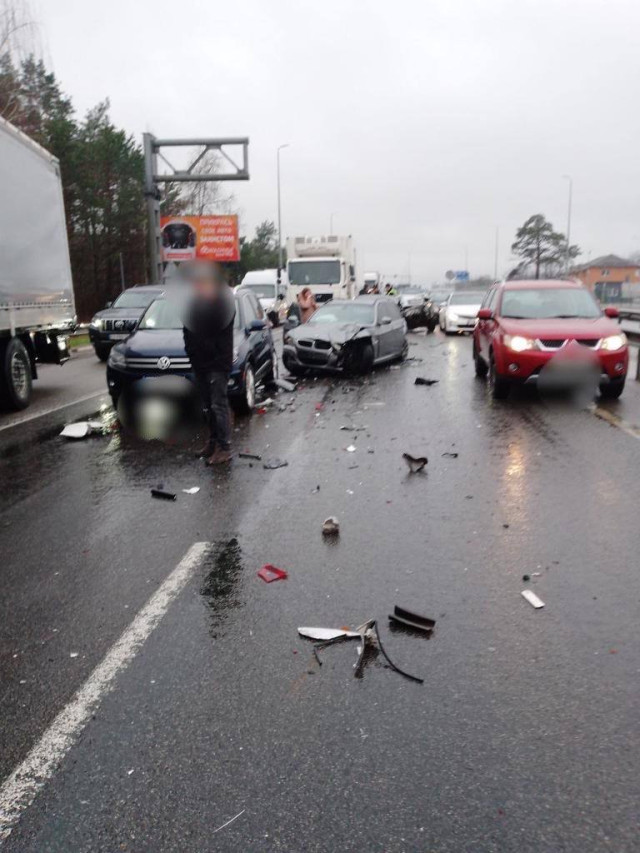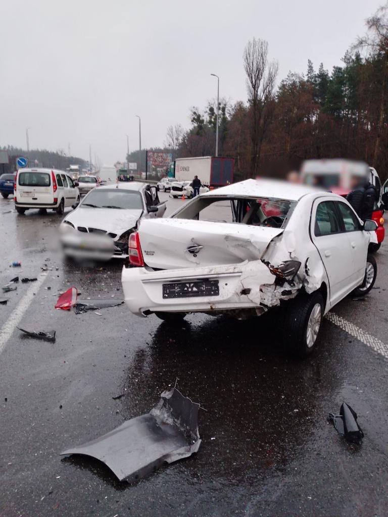 Як попередньо встановили поліцейські Київщини, близько 7:30 потік автомобілів рухався в бік Києва. Водії, які їхали в середній смузі, зупинилися для надання переваги. У цей час водії лівої – також пригальмував. А водій автобуса «Setra» не зреагував на зміну дорожньої обстановки і допустив зіткнення з автомобілями попереду.Внаслідок цього, попередньо дев'ять автомобілів зазнали різних ушкоджень.Станом на 8:30, за допомогою на місці події вже звернулись двоє людей – водій авто «Mitsubishi» та водійка «BMW». Ще до 10 осіб отримали синці та забої.