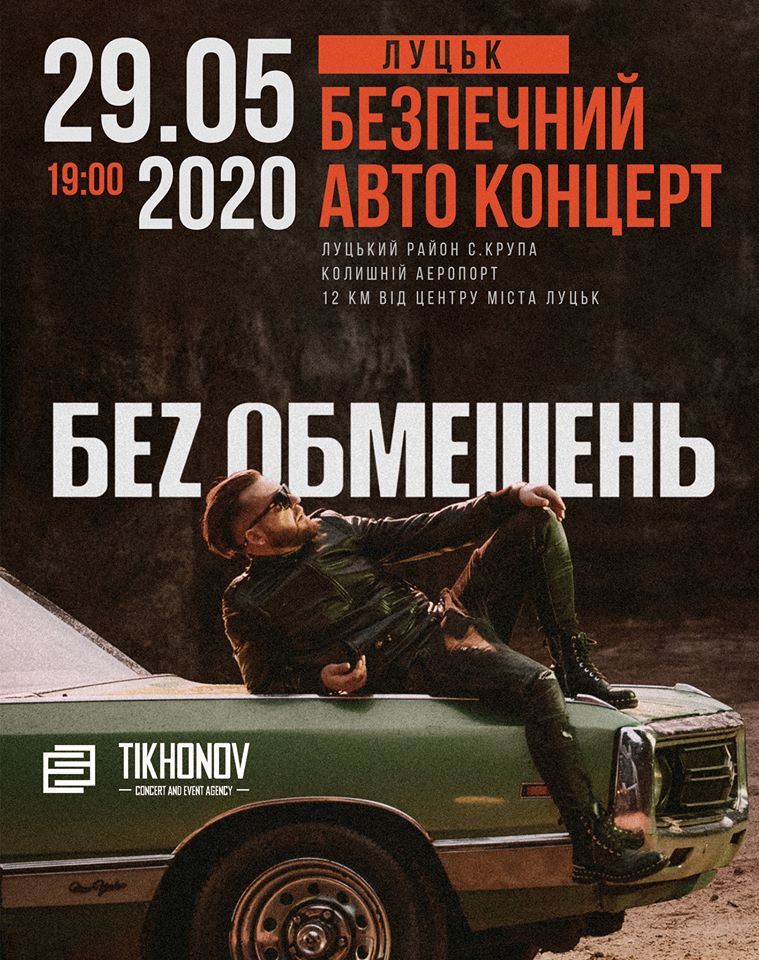 «Гурт БЕZ ОБМЕЖЕНЬ разом з івент-агенцією Tikhonov Agency вирішили порадувати своїх фанів незвичним форматом безпечних концертів. Вперше в Україні музиканти дадуть ряд концертів під відкритим небом, де глядачі слухатимуть його в автомобілі. Перший концерт відбудеться 29 травня поблизу міста Луцьк (с. Крупа) на території колишнього аеропорту. Таку ідею вирішили впровадити, щоб підтримати прихильників, які через карантин не можуть відвідати концерти улюбленого гурту. Під час заходу заборонено виходити з транспорту, в ньому має бути не більше двох людей. Слухати концерт можна як відкривши вікна, так i через радіоприймач авто – звук транслюватиметься на особливій фм частоті!, – йдеться в повідомленні..