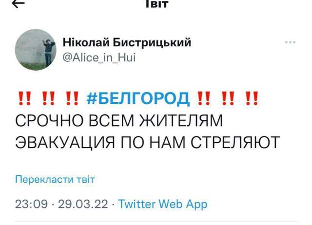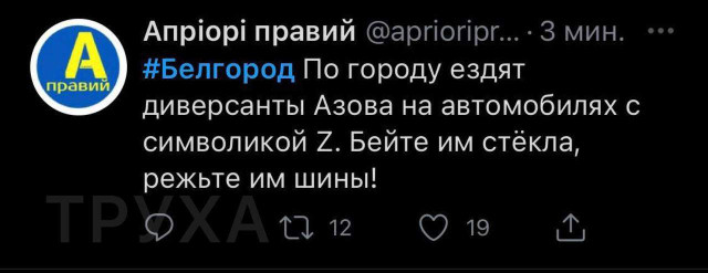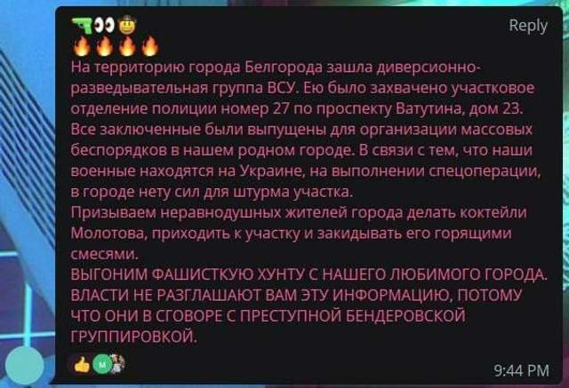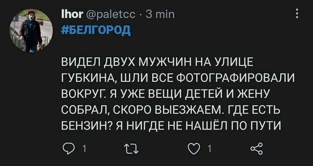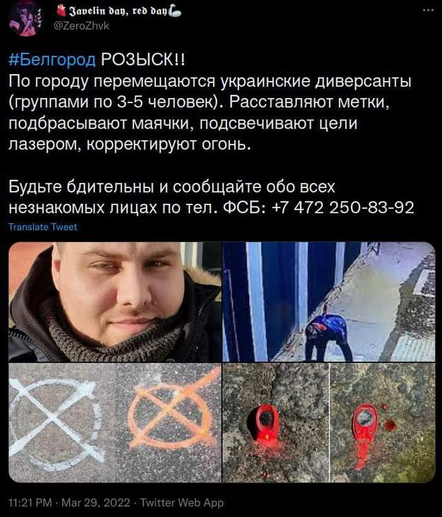 Тепер у місцевих чатах розносять фейки, якими росіяни атакували нас у перші дні повномасштабної війни. Зокрема, білгородців попереджають про розставлені в місті мітки та позначені на мапі «фермерські господарства» (їх вважають наступними цілями для «ударів»).Мешканців Білгорода попереджають про українських «диверсантів».І поки «сусіди» панікують, українці запрошують їх до, наприклад, Харкова.Кажуть, «азовці» їздять російським містом на військовій техніці, що маркована літерою Z.