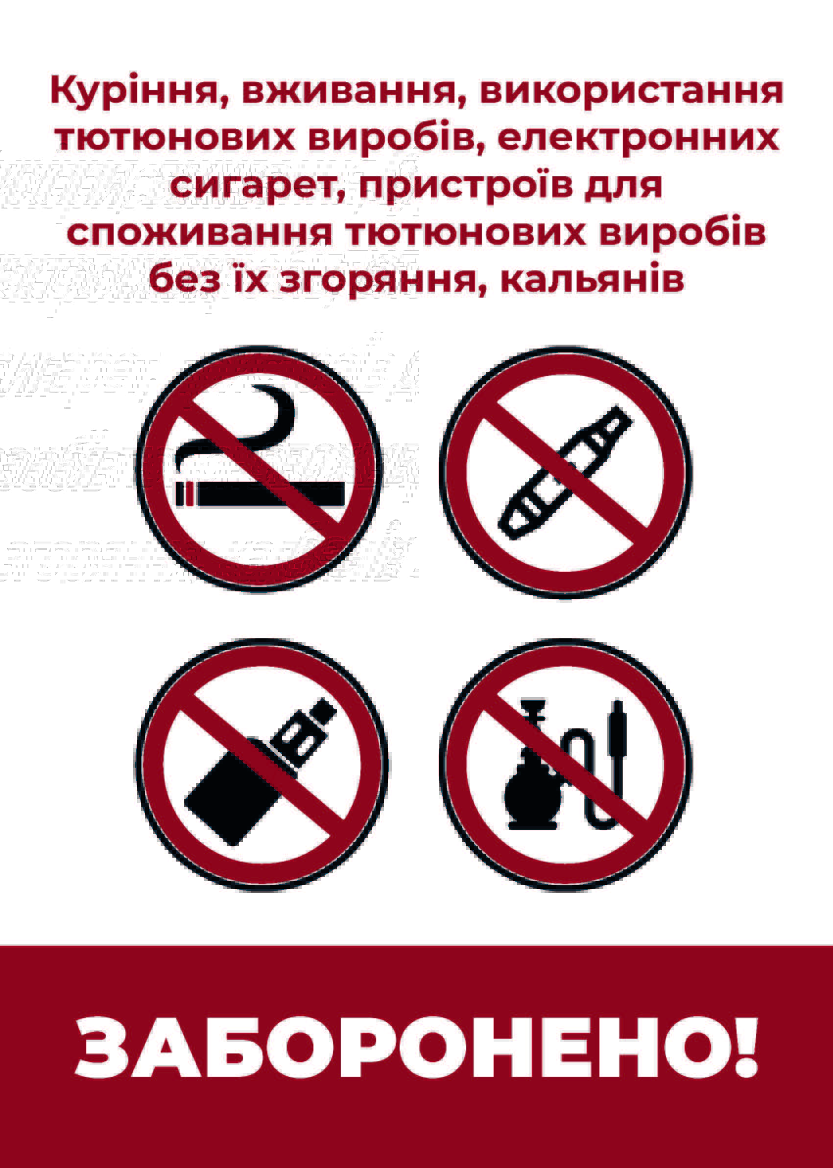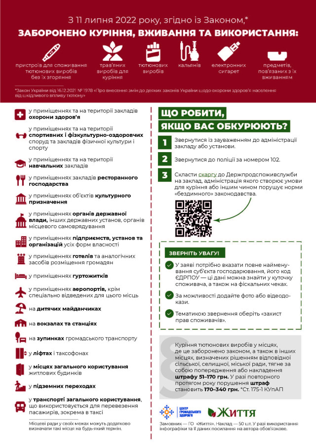У всіх перелічених громадських місцях (закладах господарювання) має бути розміщено графічний знак про заборону куріння і текст: "Куріння, вживання, використання тютюнових виробів, електронних сигарет, пристроїв для споживання тютюнових виробів без їх згоряння, кальянів заборонено!". Нерозміщення цієї інформації також передбачає штраф у розмірі 1 тисяча гривень."Абсолютна більшість громадян України підтримують нововведення. Згідно з опитуванням, проведеним Київським міжнародним інститутом соціології у травні 2022 року, 80% українців підтримують заборону куріння сигарет для нагрівання в громадських місцях. При цьому дві третини українців готові проактивно захищати своє право на бездимне повітря", – прокоментував виконавчий директор ГО "Центр громадянського представництва "Життя" Дмитро Купира.