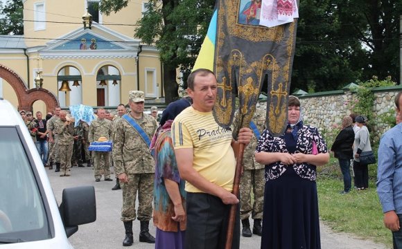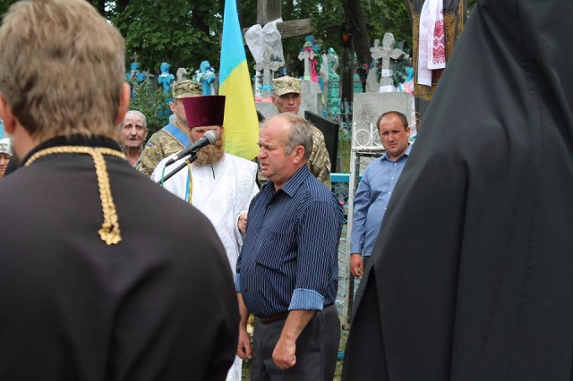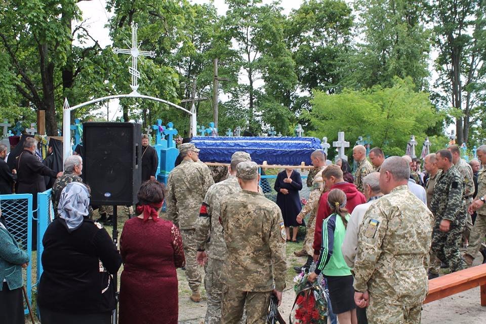 Від храму до кладовища учасники АТО несли на руках труну героя-захисника, вигукуючи патріотичні гасла. Біля кладовища відбулася поминальна панахида. За упокій душі бійця молився отець Арсеній.