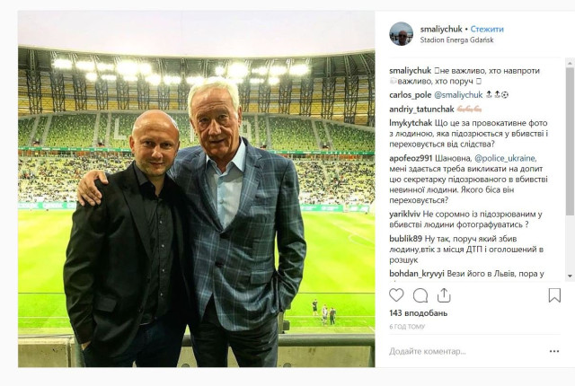 На фото Петро Димінський та Олег Смалійчук на стадіоні «PGE Арена Гданськ», де у неділю, 9 вересня, львівські «Карпати» зіграли товариський матч проти місцевої «Лехії».Нагадаємо, 18 серпня 2017 року поблизу села Ямельня на Львівщині Mercedes, що належить Петрові Димінському, в’їхав у легковик, за кермом якого була 31-річна Наталія Тріла. Жінка померла на місці. Провину за аварію взяв на себе охоронець Димінського Андрій Борщ. Сам Петро Димінський 22 серпня виїхав закордон. Після цього в Україну він не повертався.