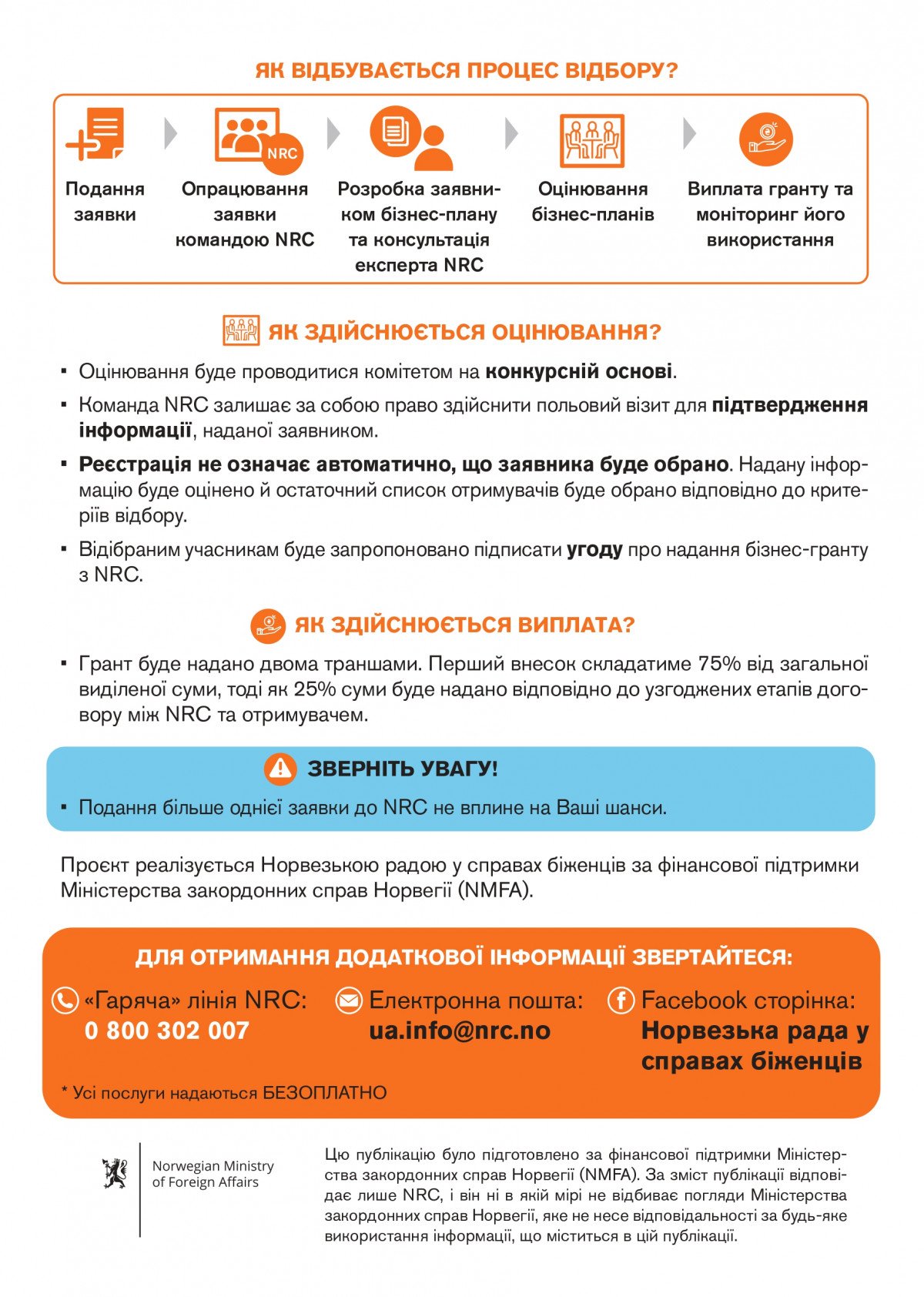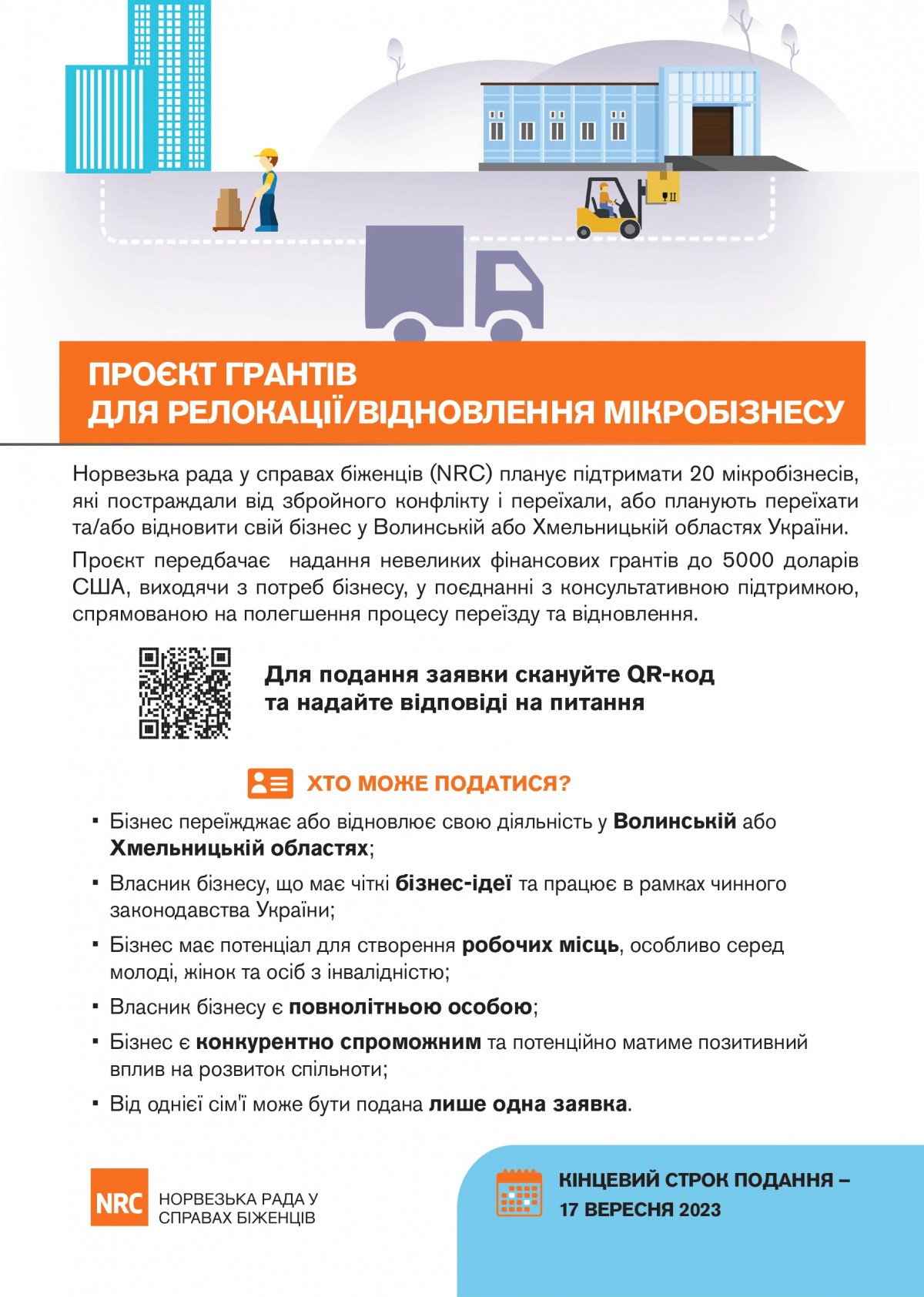 Норвезька рада у справах біженців (NRC) планує підтримати 20 мікробізнесів, які постраждали від збройного конфлікту і переїхали, або планують переїхати та/або відновити свій бізнес у Волинській або Хмельницькій областях.