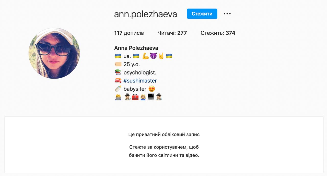 У соціальних мережах Анна не активна або ж має закриті профілі. Як ідеться на сторінці в Instagram, два роки тому вона представляла себе як психолога, сушиста та няню. Відомо, що у 2014 році вона навчалася на першому курсі факультету психології Волинського національного університету імені Лесі Українки.