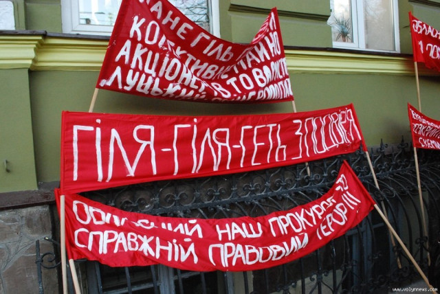 Отож, приблизно два десятки учасників пікету розвісили плакати з написами штибу «Геть Гіля з подвір’я», «Досить беззаконня прокурорів» та інші. Вони скандували заклики з вимогою відставки Гіля та очищення лав правоохоронців від корупціонерів.