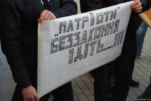 Водночас, поруч із входом до обласної прокуратури, зібралося 8 молодих хлопців, що розгорнули плакати з написами штибу «Нікітюк – руки геть від прокуратури», «Патріоти» беззаконня ідіть…!!!» та інші. Вони відмовилися розмовляти з пресою. Проте згодом сказали, що прийшли захистити чесне ім’я Гіля.
