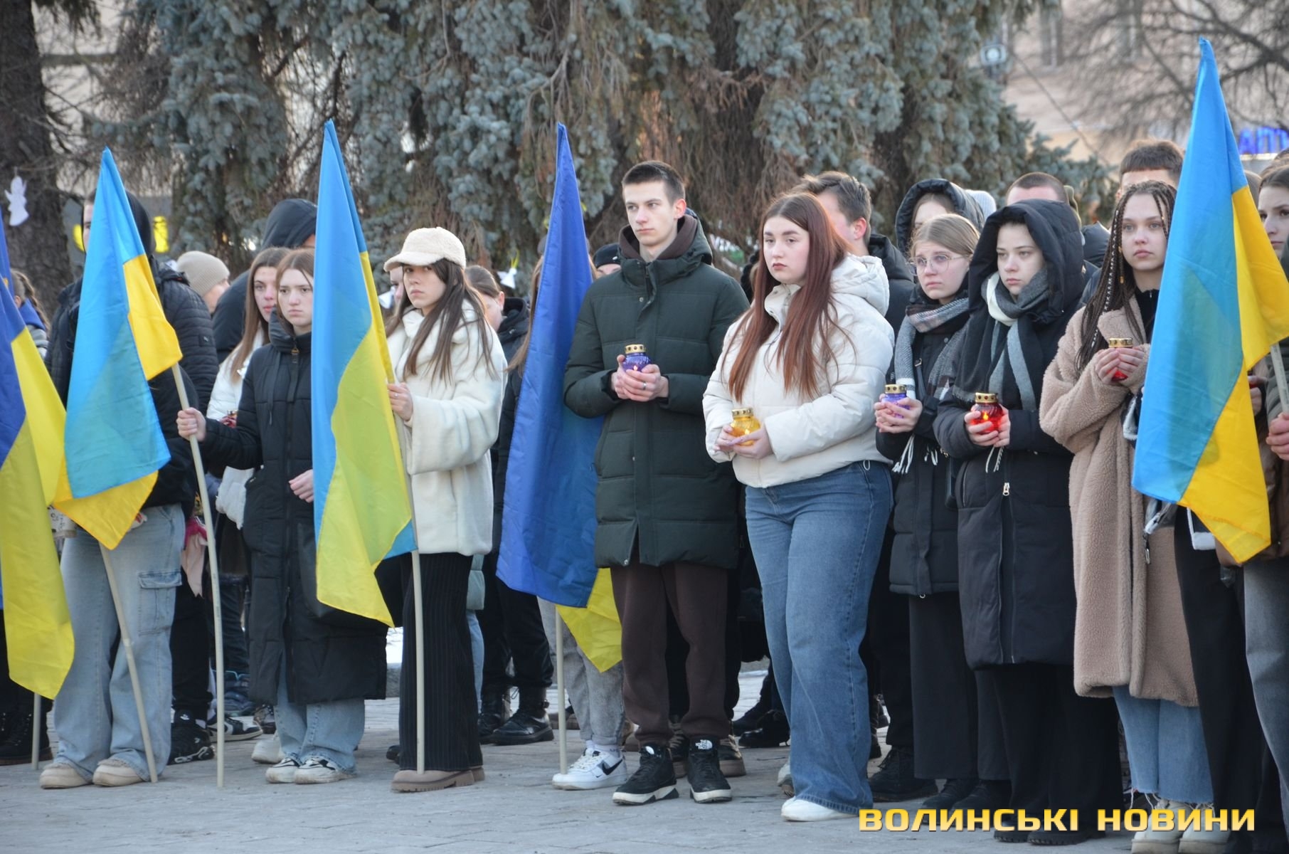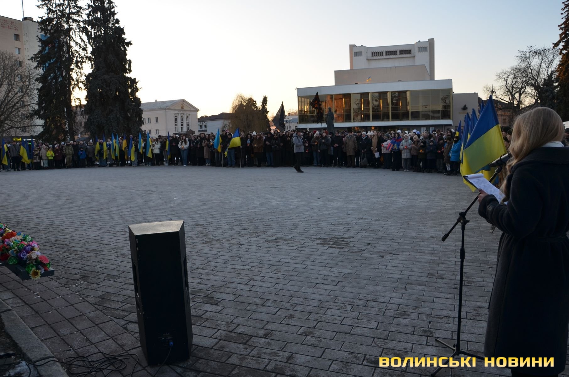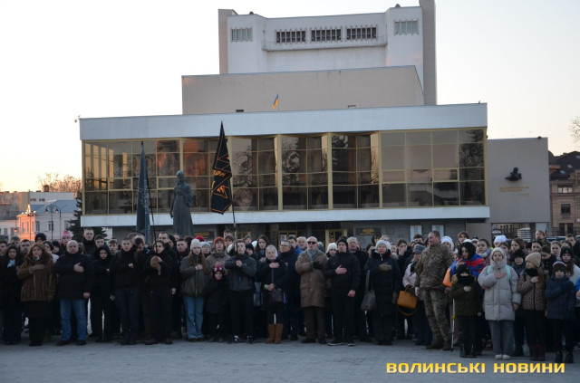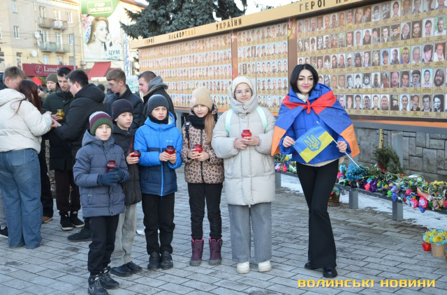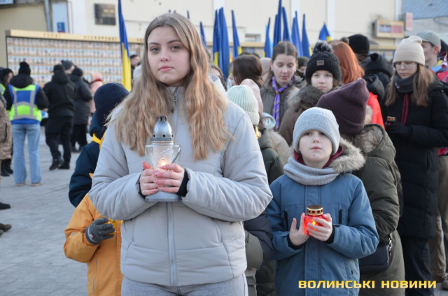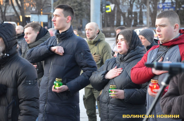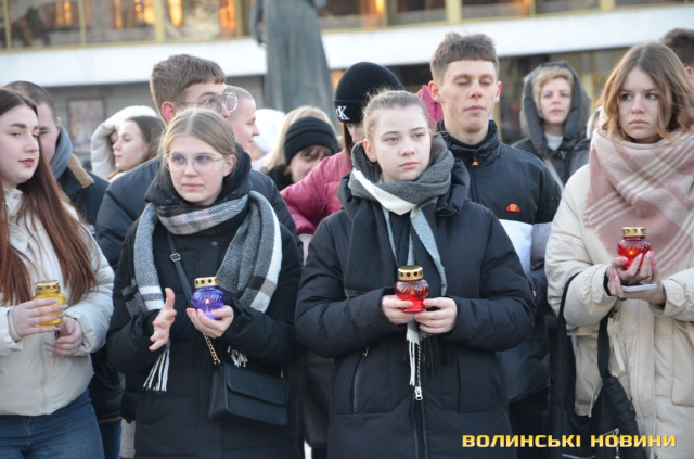 В обласному центрі Волині у форматі віче вшанували подвиг учасників Революції Гідності. Пам’ятний захід розпочався надвечір на Театральному майдані біля фотостенду Героїв нескореної України. До нього долучилися небайдужі жителі міста, ліцеїсти, студенти, активна молодь.