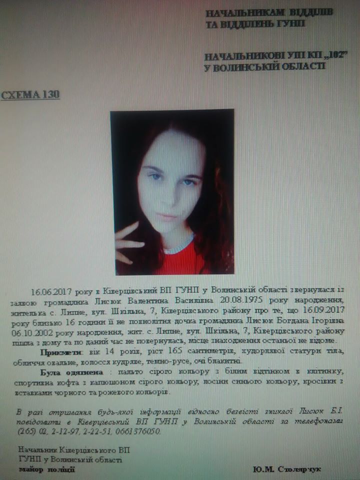 "16.09.17 близько 16 години неповнолітня донька Богдана Лисюк, мешканка села Липне Ківерцівського району, пішла з дому і досі не повернулася. Місцезнаходження дівчинки - невідоме", - йдеться у дописі.
