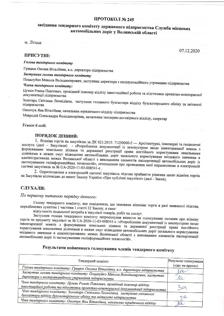 Тендер на розроблення документації із землеустрою щодо інвентаризації земель з формуванням земельних ділянок та державної реєстрації права постійного користування земельними ділянками в межах смуг відведення автомобільних доріг загального користування місцевого значення в адміністративних межах Волинської області з виконанням елементів паспортизації автомобільних доріг із застосуванням геоінформаційних технологій оголосили 3 листопада. Ціна питання – 65 мільйонів гривень. Передбачалося, що пропозиції прийматимуть до 6 грудня 2020 року. Аукціон мав розпочатися 11 січня 2021 року.