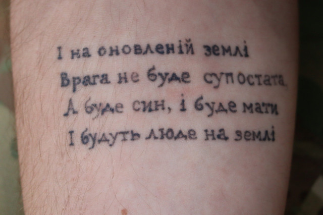 «Ніколи не мав бажання зробити татуювання. А тоді просто загорівся цією ідеєю. Відбувши наряд і маючи чотири години вільного часу, я відпросився в командира й помчав у найближче містечко, де є салон тату. Майстер був неабияк заскочений – ніколи раніше поезію Шевченка йому набивати не доводилося. Впоралися за три години – тож на службу не запізнився. Жодного разу про той свій крок я не пошкодував. Але точно знаю: це перше та єдине татуювання в моєму житті», – переконаний боєць.