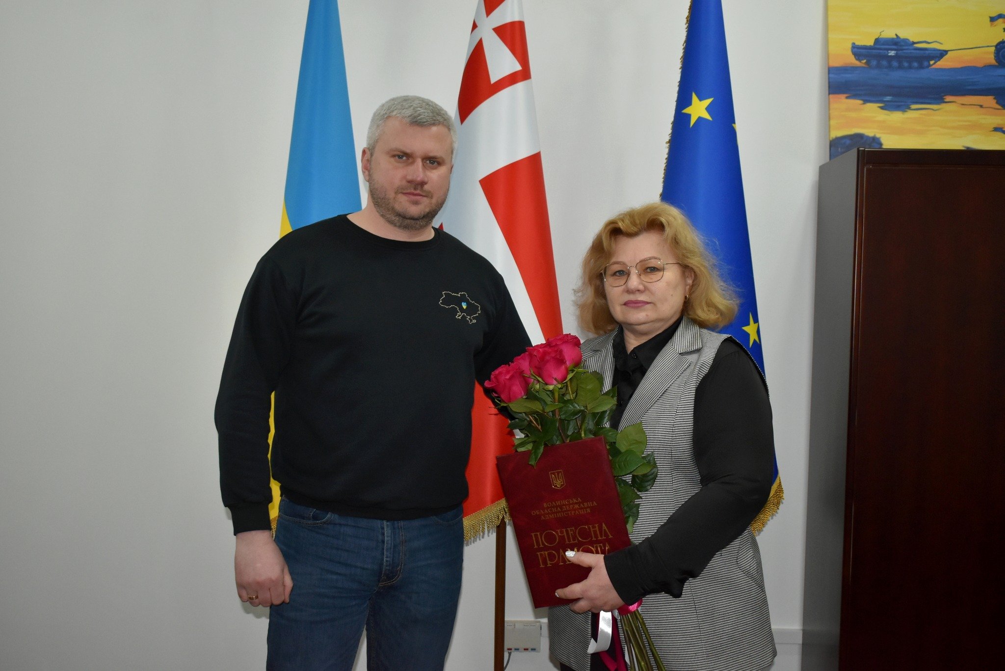 Грамоту вручив перший заступник голови облдержадміністрації Сергій Мовенко, як символ подяки за багаторічну сумлінну працю та у зв‘язку із виходом її на пенсію.
