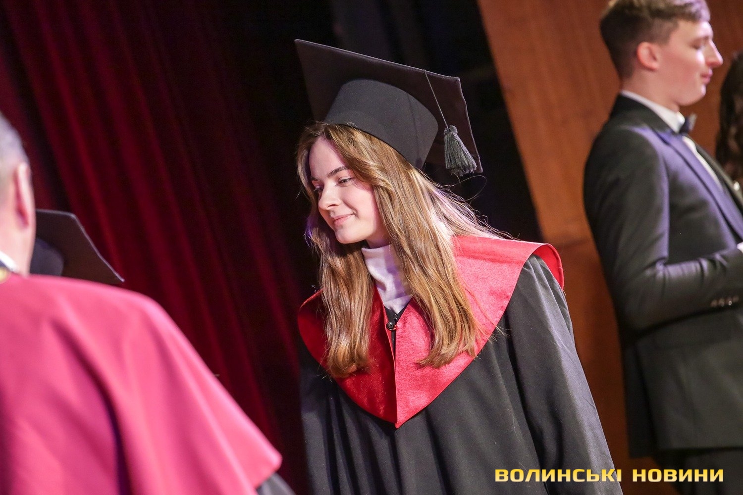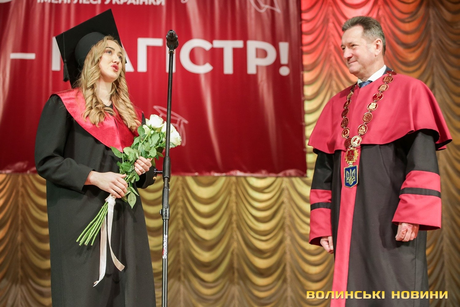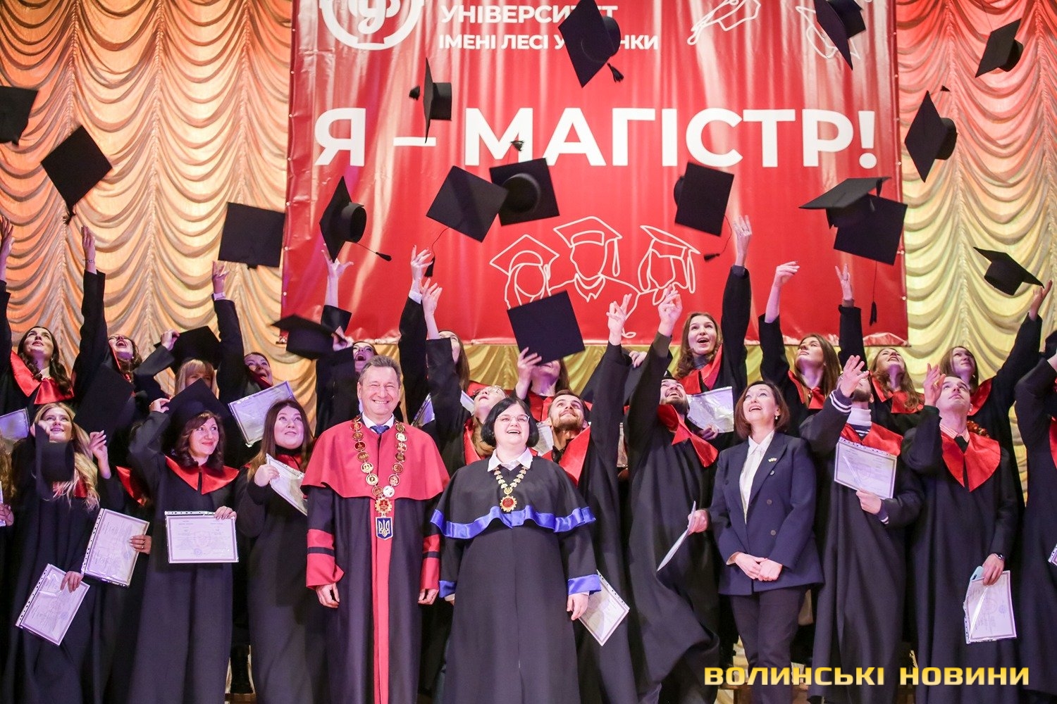 «Ви обрали освіту в час війни задля перемоги, адже ви прийшли вчитися, щоб бути у країні переможців. Україна має перемогти клятого агресора – Росію. Пройдуть десятиліття і ви розповідатимете, як завершували навчання в потужному університеті. Найголовніше, що я сьогодні хотіла вам сказати: нині потрібний соціальний контракт між вами і суспільством про те, що ви свідомі у відбудові української економіки. Я сподіваюся, що 1662 магістри ВНУ – це потужна сила, яка створить прорив», – сказала Ірина Констанкевич.Від представників влади – голови Волинської обласної ради Григорія Недопада та заступниці Луцького міського голови Ірини Чебелюк – також звучали вітання для магістрів. Вони побажали випускникам знайти себе та закликали долучатися до відбудови незалежної та вільної України, коли ми здобудемо перемогу.Після вітань випускники нарешті дочекалися найурочистішої та найсвятковішої для них миті – вручення дипломів, які свідчать про те, що вони здобули освітньо-кваліфікаційний рівень магістра. Кожен з факультетів ВНУ почергово отримував дипломи та привітання від своїх близьких.Цікаво, що деякі випускники навіть на урочистість прийшли з портфелями та рюкзаками, не відпускаючи студентське життя.Однак підкинуті вгору академічні шапки все ж символічно сповістили про завершення шляху магістра у Волинському національному університеті імені Лесі Українки.