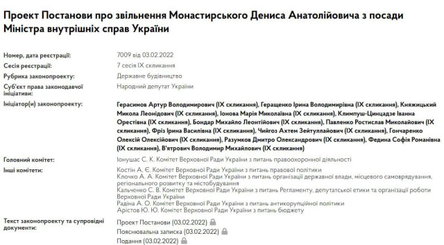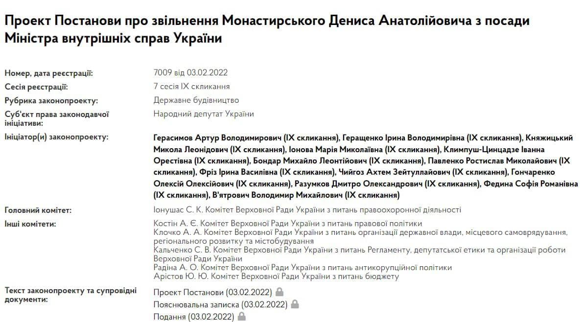 Після скандалу з Трухіним у Верховній Раді зареєстрували постанову про звільнення міністра внутрішніх справ Дениса Монастирського.