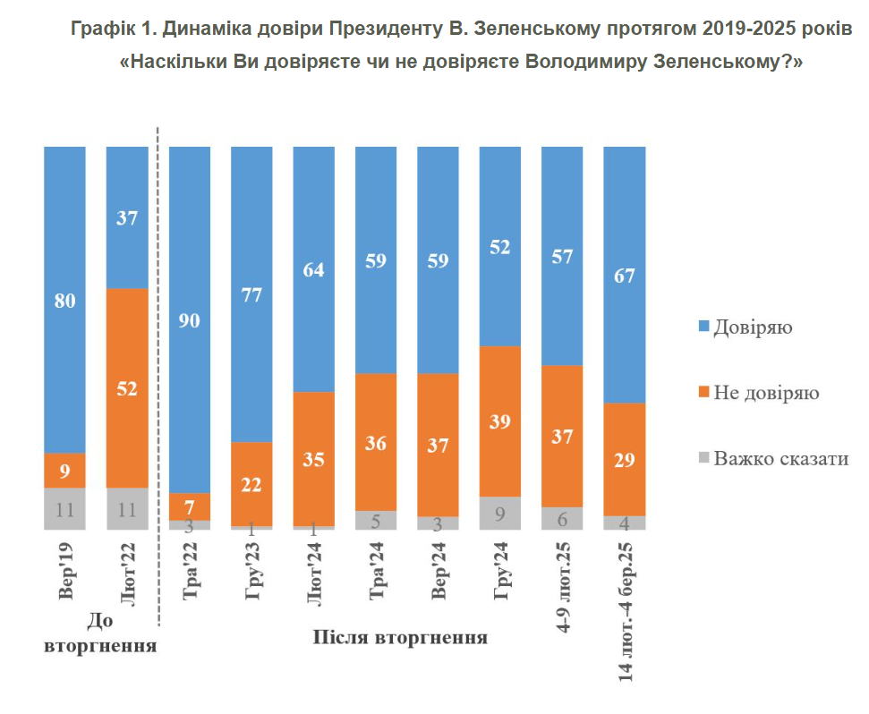 За даними КМІС станом на першу половину лютого 2025 року, до загострення відносин України і США, Зеленському довіряли 57% українців, не довіряли – 37%. Баланс довіри-недовіри становив +20%.Далі, у період 14 лютого – 4 березня рівень довіри зріс до 67%, а частка тих, хто не довіряє, знизилася до 29%. Відповідно, баланс довіри-недовіри покращився до +38%.