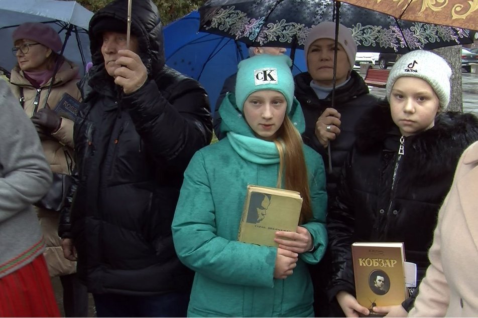 Восьмикласниця Христина Домбровська приїхала на акцію з Гірки Полонки. Каже: прийшла з сімейною реліквією – виданням «Кобзаря», яке у родині передають із покоління в покоління.«Я його читала багато разів, він 1965 року. Він спочатку був у моєї прабабусі, потім у бабусі, мами і тепер в мене», – розповідає школярка.