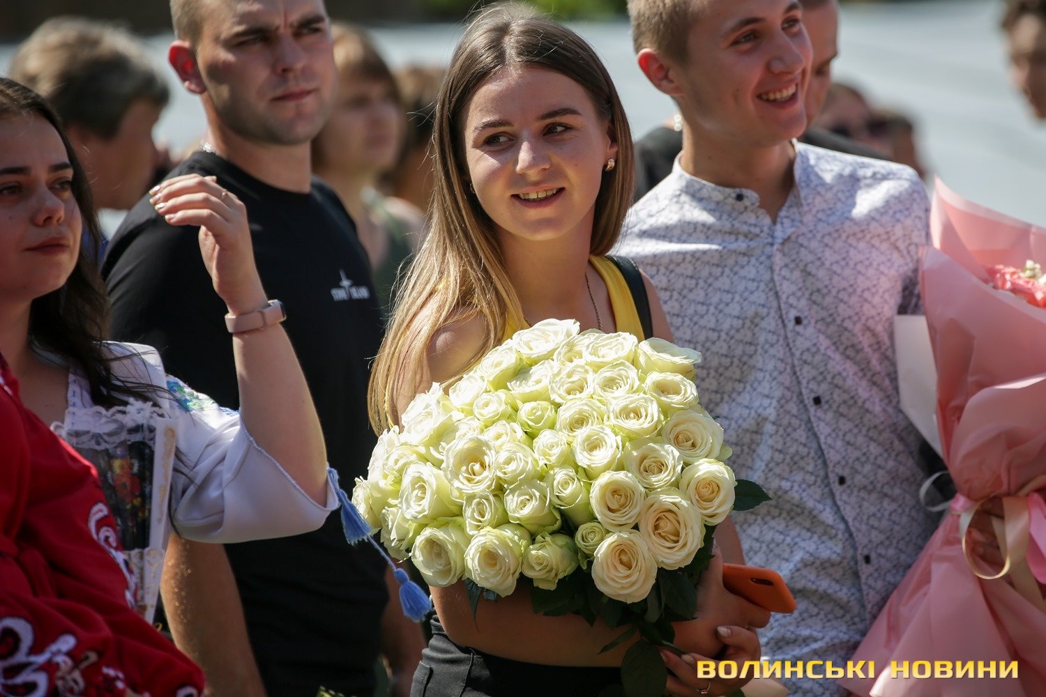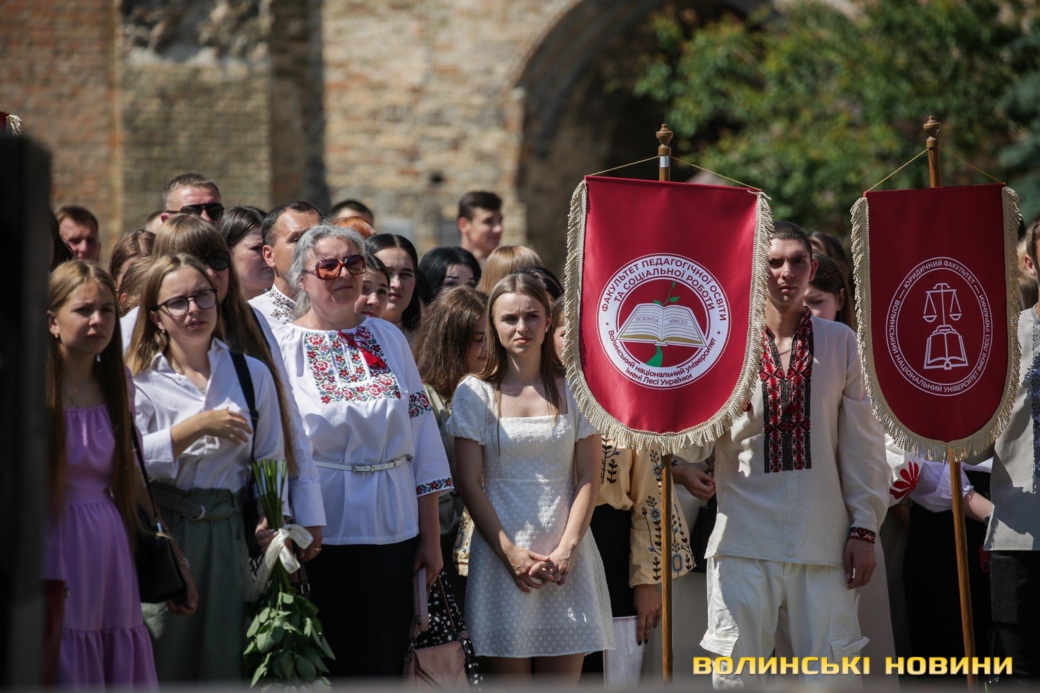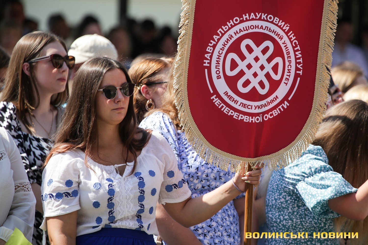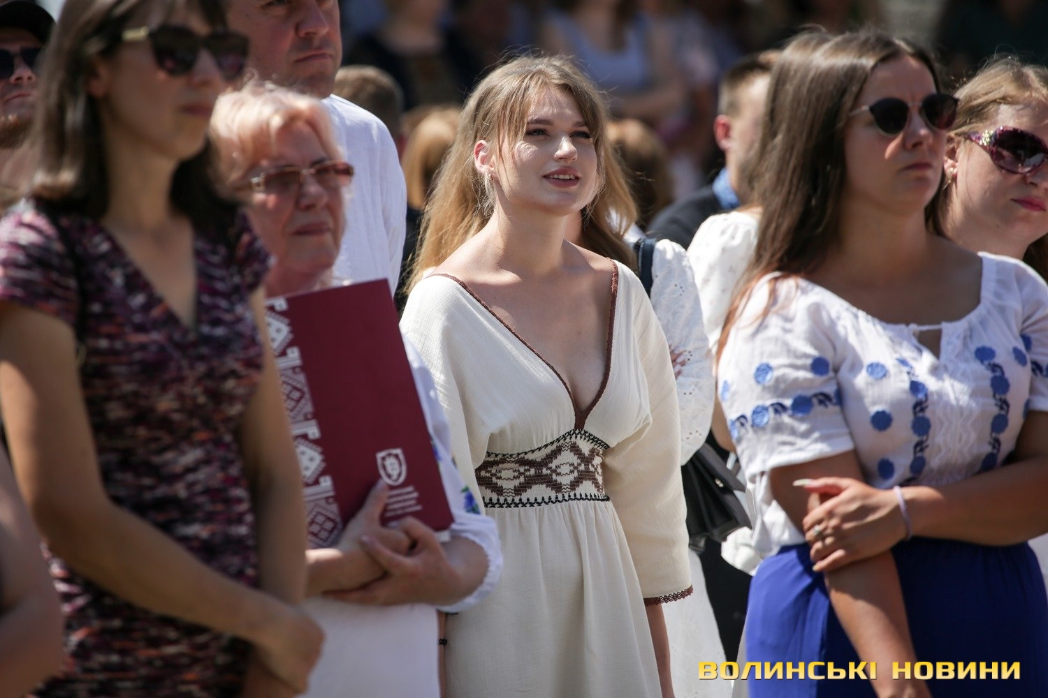 «Ви нарешті отримаєте папір, складений вдвоє, адже слово «диплом» саме так і перекладається. З цього місця, де ви стоїте, є дві дороги: перша – наукова, тобто вступ у магістратуру, друга – на вінчання в храм. Хай яку ви оберете, нехай вона буде для вас щасливою у нашій Україні», – побажав владика.Не обійшлося дійство і без привітання ректора ВНУ Анатолія Цьося, який розповів про успіхи університету в нелегкий час. Він також пригадав, що 16 липня 1993 року було підписано указ президента про створення Волинського державного університету імені Лесі Українки, що дозволило суттєво поліпшити освіту на території заходу України.