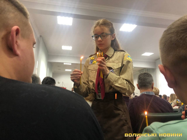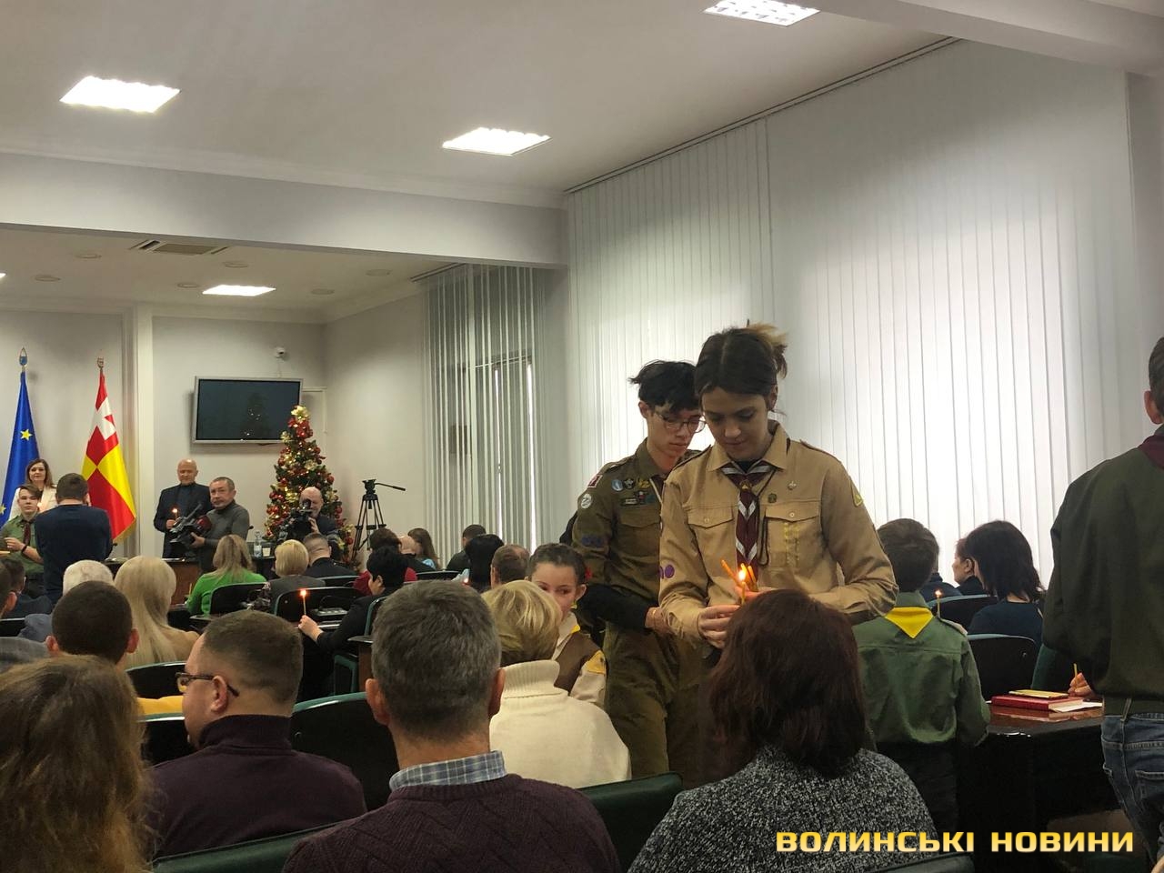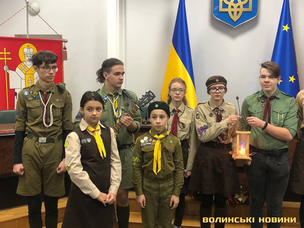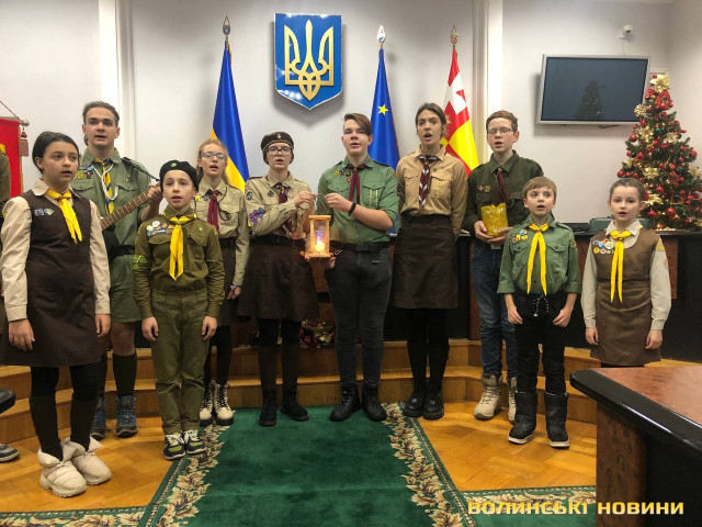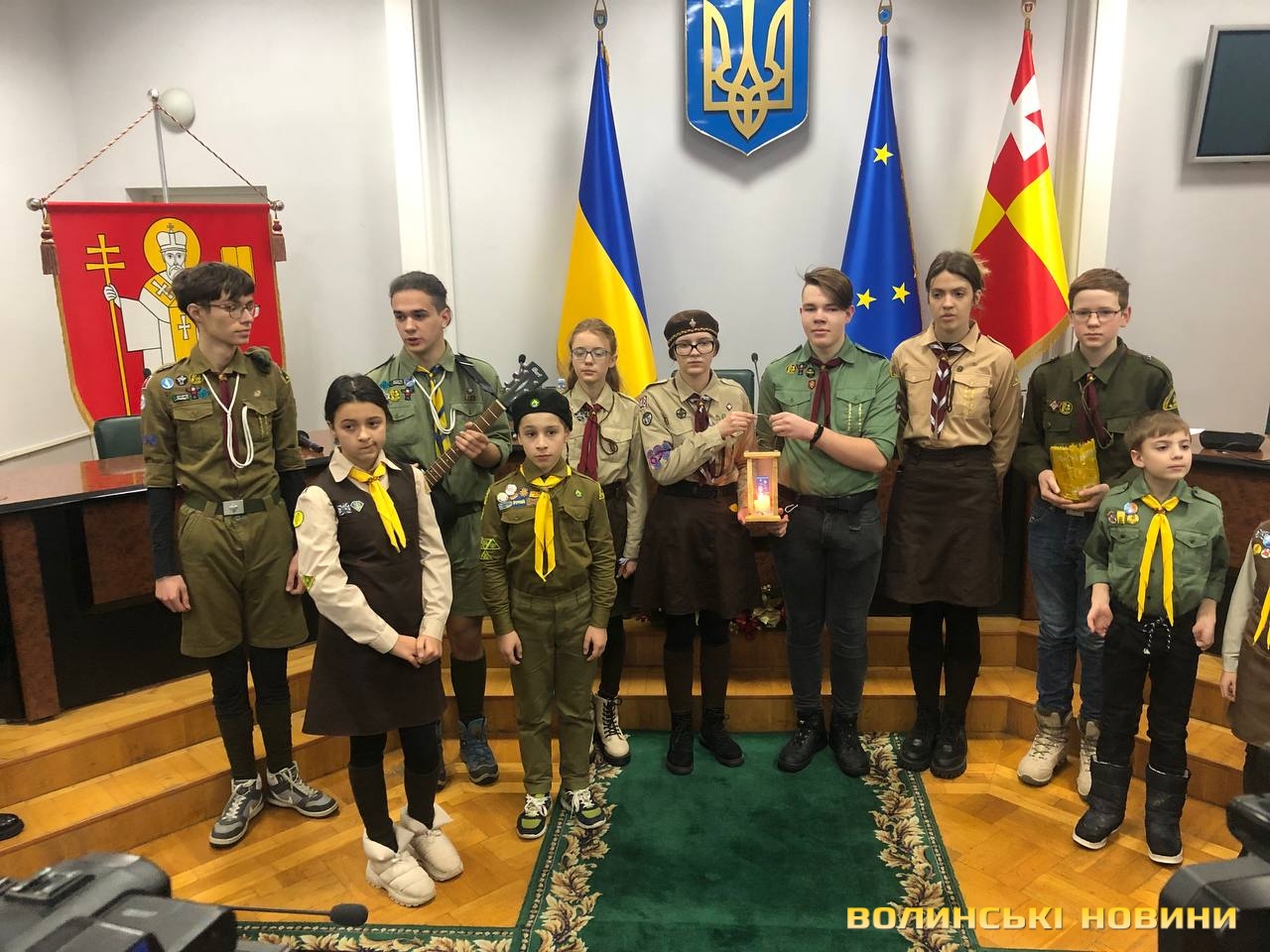 До Луцької міської ради прийшли діти з Національної скаутської організації «Пласт», принісши Вифлеємський вогонь миру.